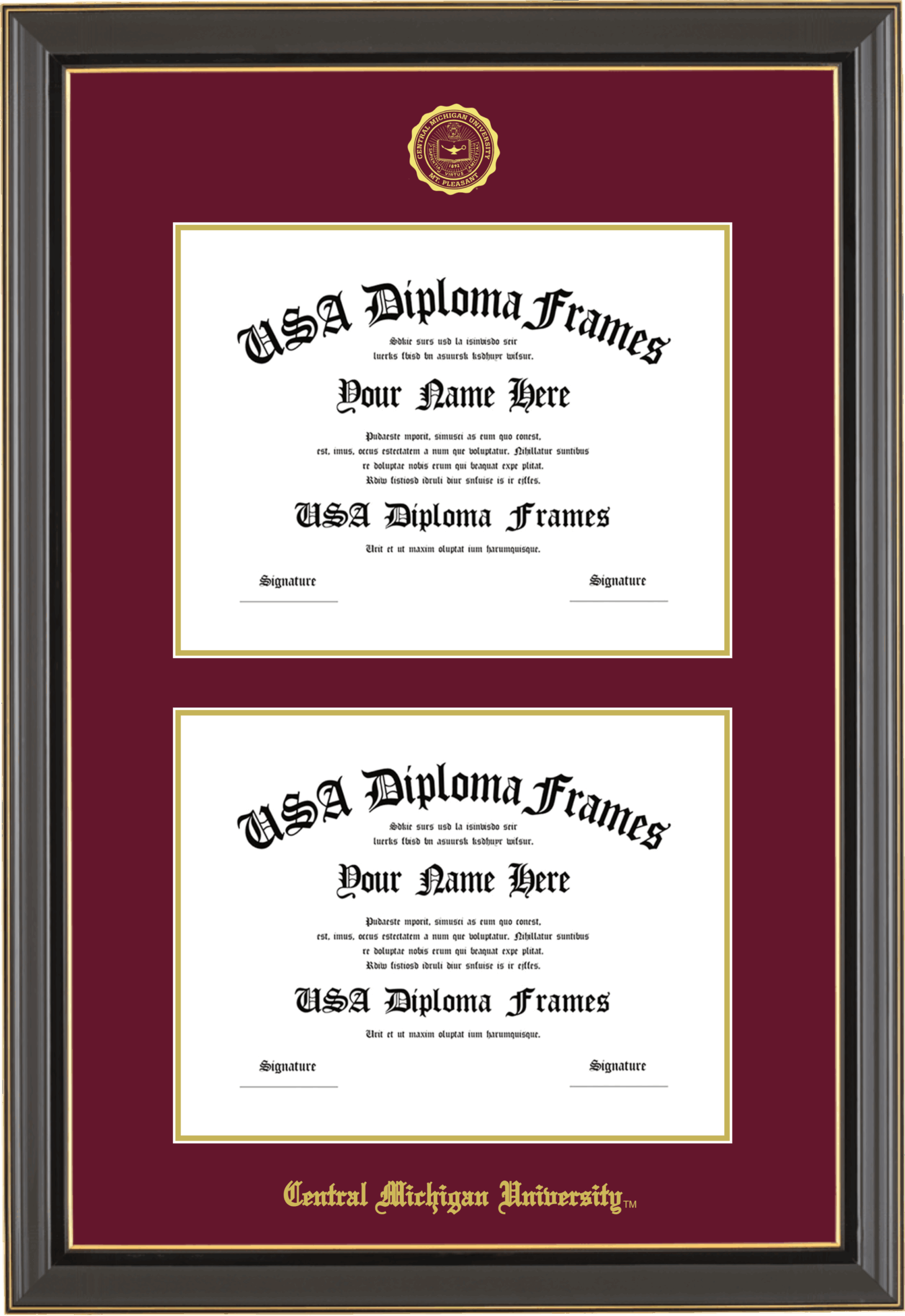 Central Michigan University Double Diploma Frame – Double Document – Black Gold Trim Glossy – Maroon and Gold Mat