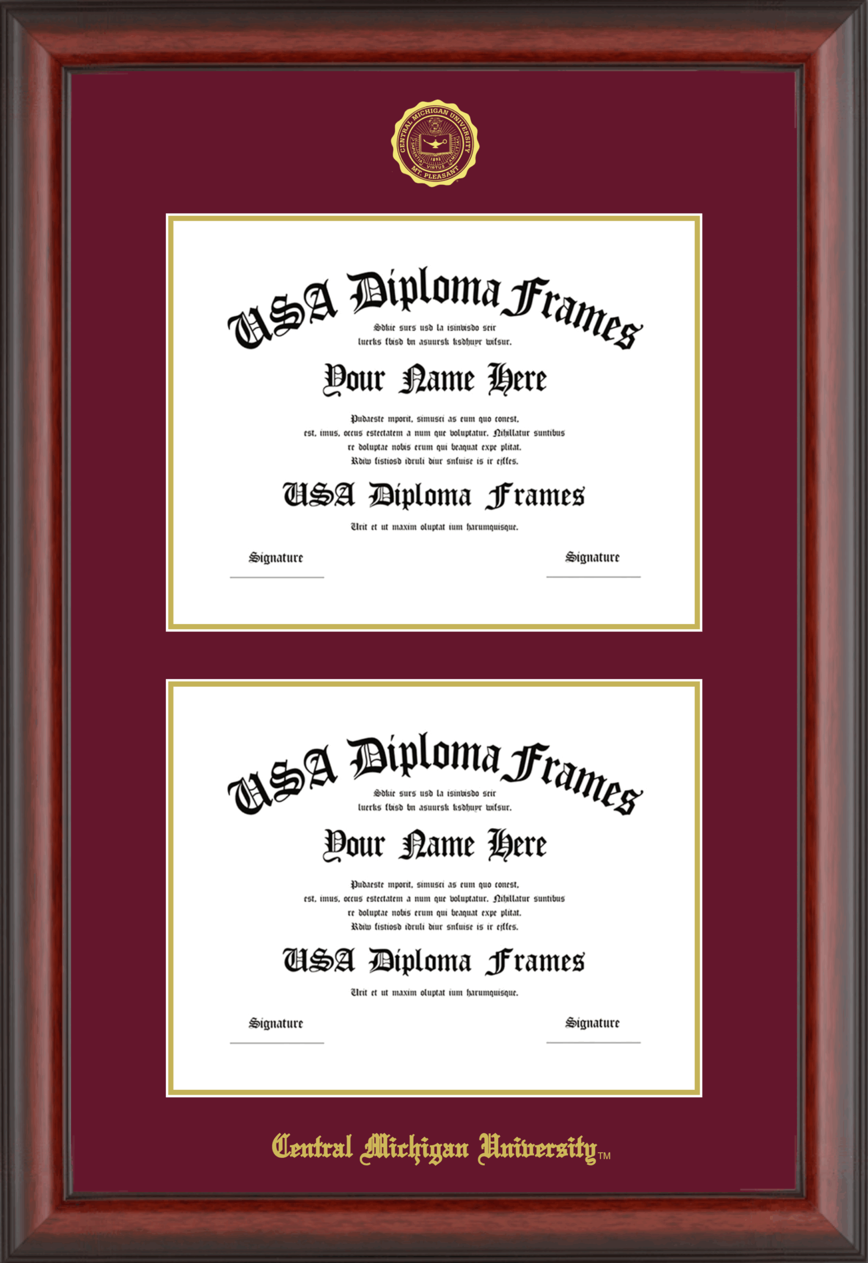 Want to explore more styles? Browse our full range of diploma frame layouts, or visit the Central Michigan University to view options available for your school. Looking for a fully personalized design? Try our custom Frame Builder and create a frame that’s uniquely yours.