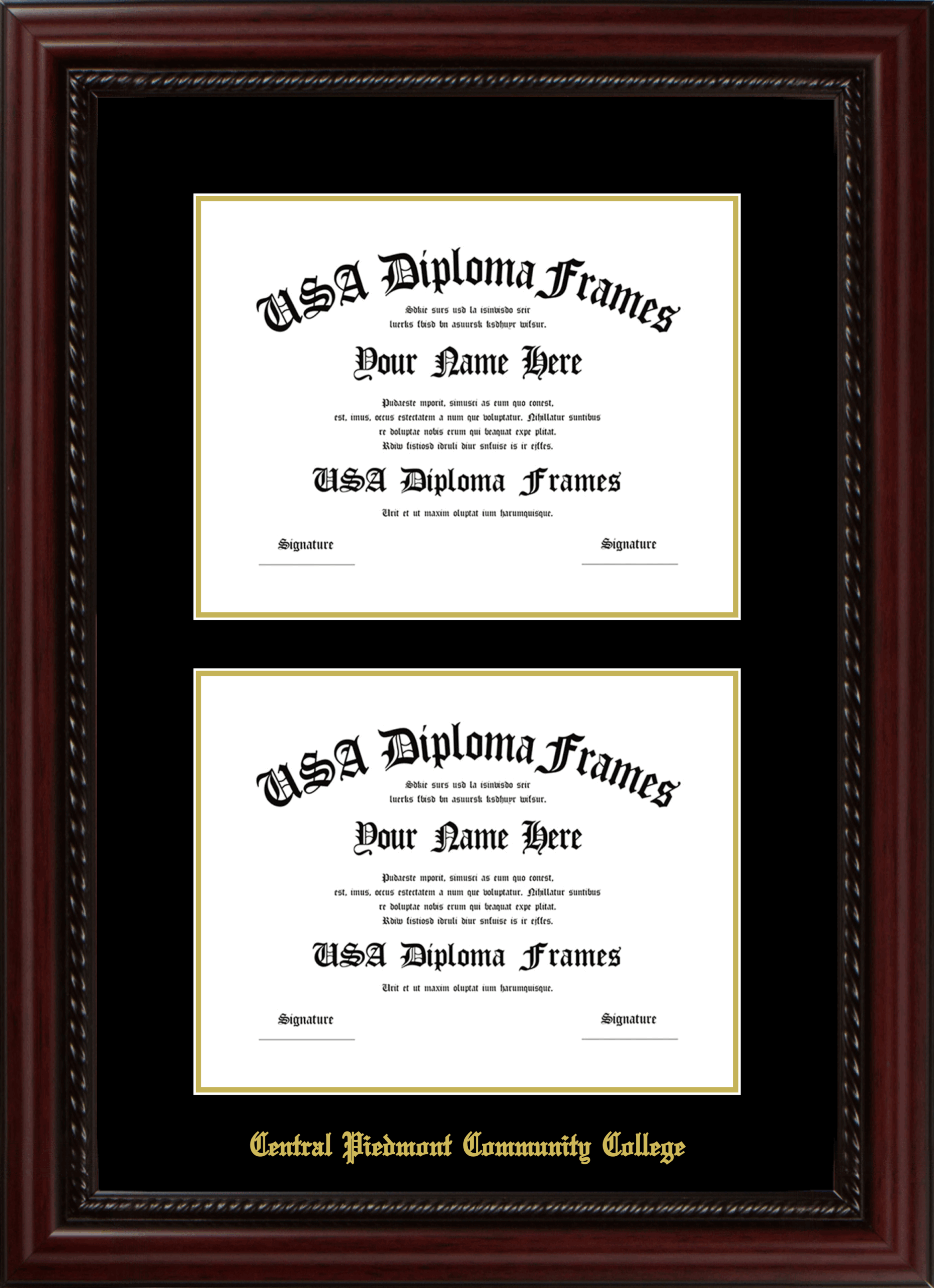 Central Piedmont Community College Double Diploma Frame – Double Document – Executive Cherry Rope – Black and Gold Mat