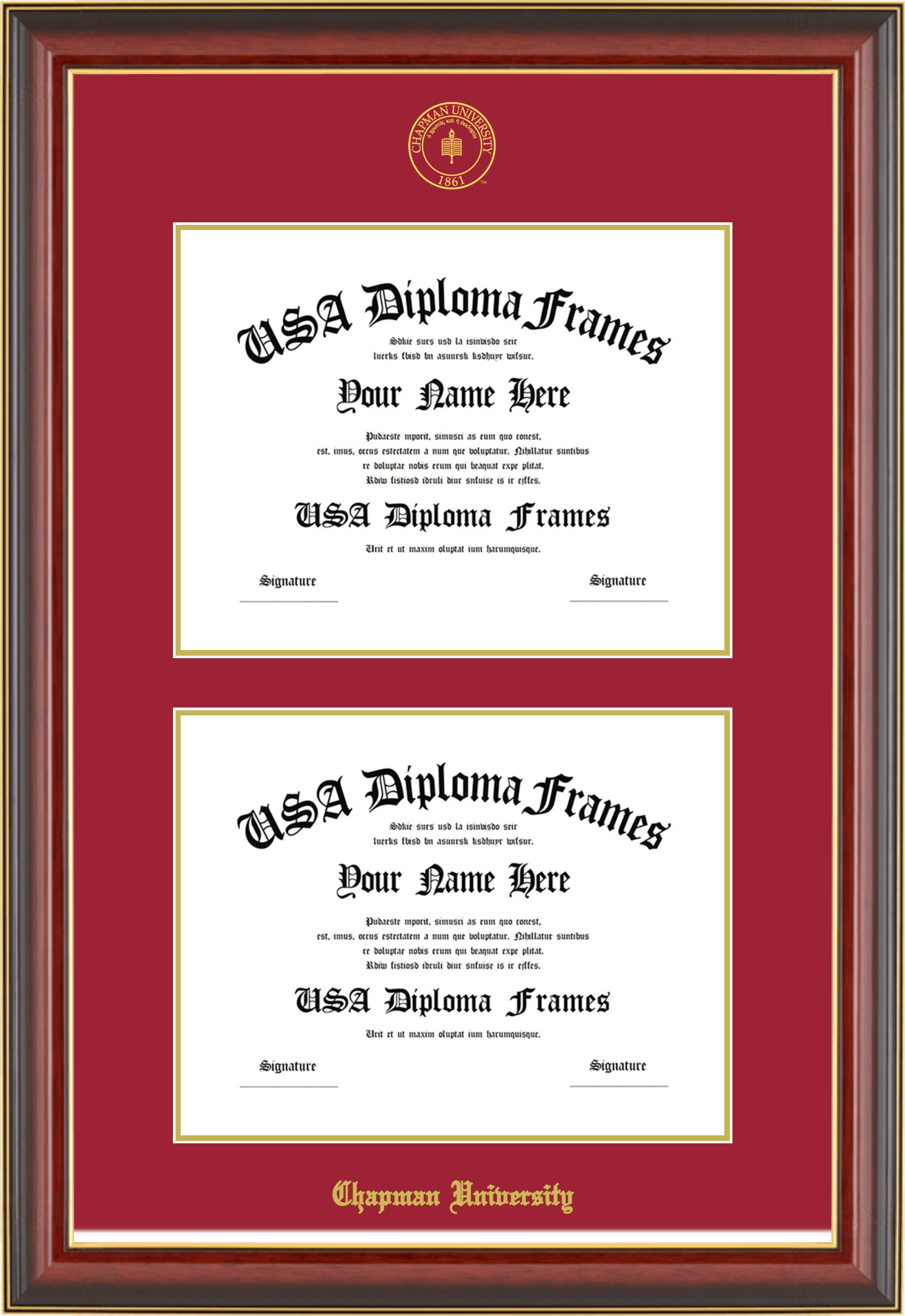 Chapman University Double Diploma Frame – Double Document – Cherry Mahogany Gold Trim Glossy – Crimson and Gold Mat