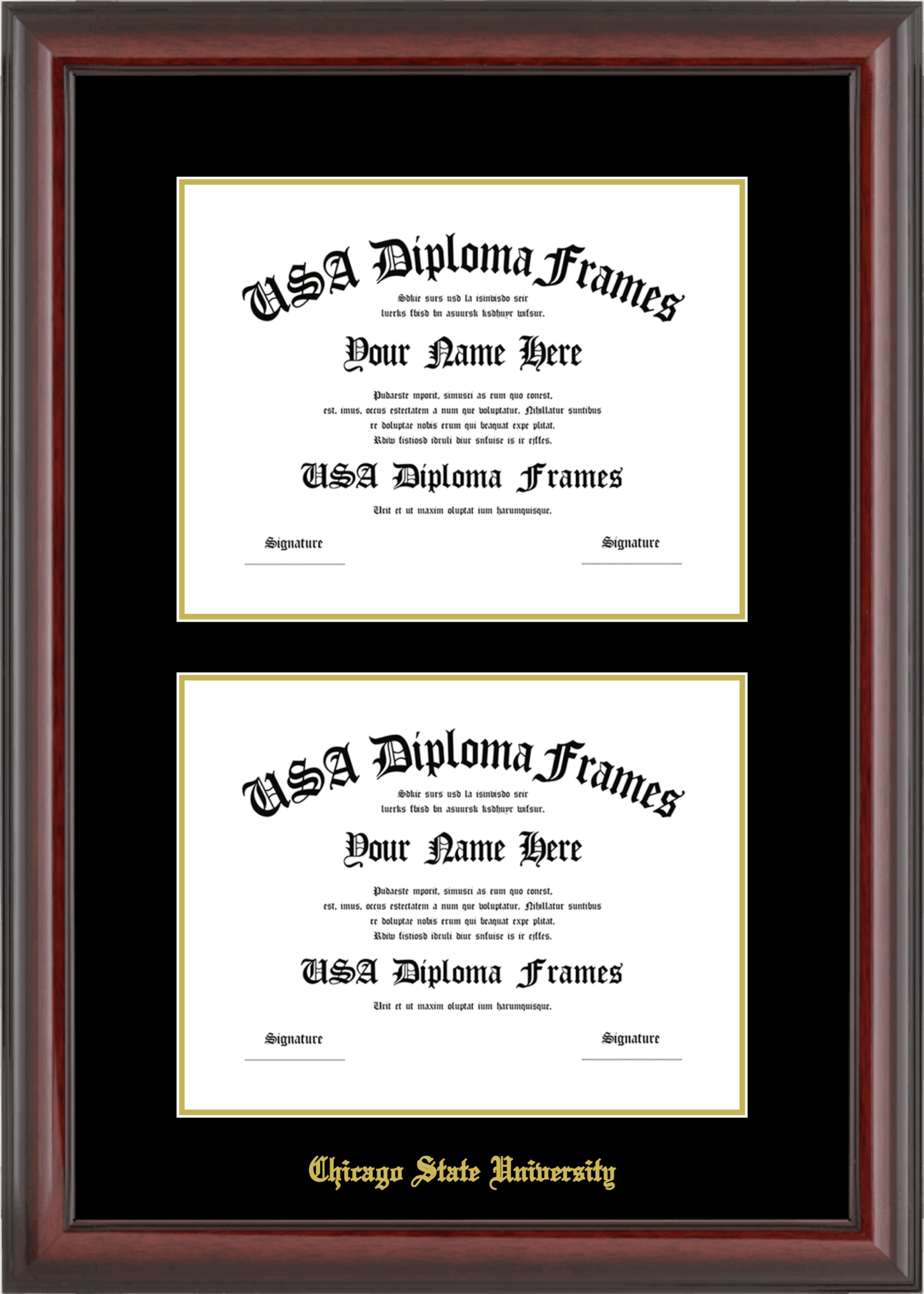 Chicago State University Double Diploma Frame – Double Document – Cherry Mahogany Glossy – Black and Gold Mat