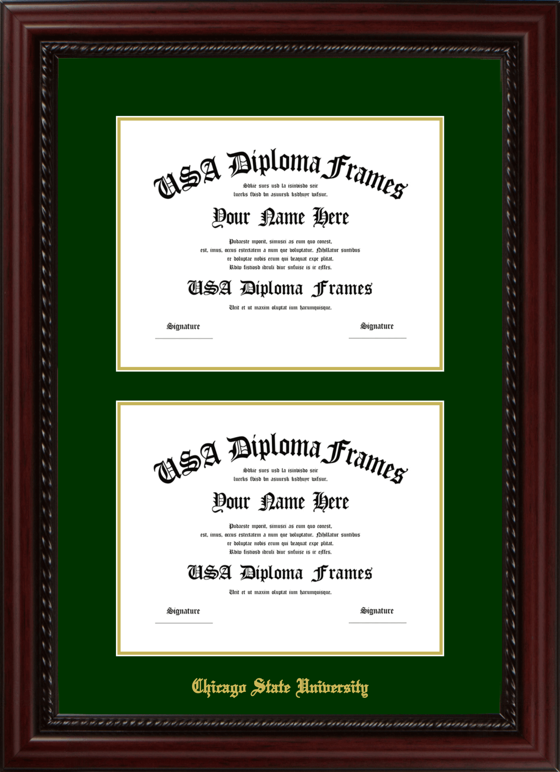 Chicago State University Double Diploma Frame – Double Document – Executive Cherry Rope – Winter Green and Gold Mat