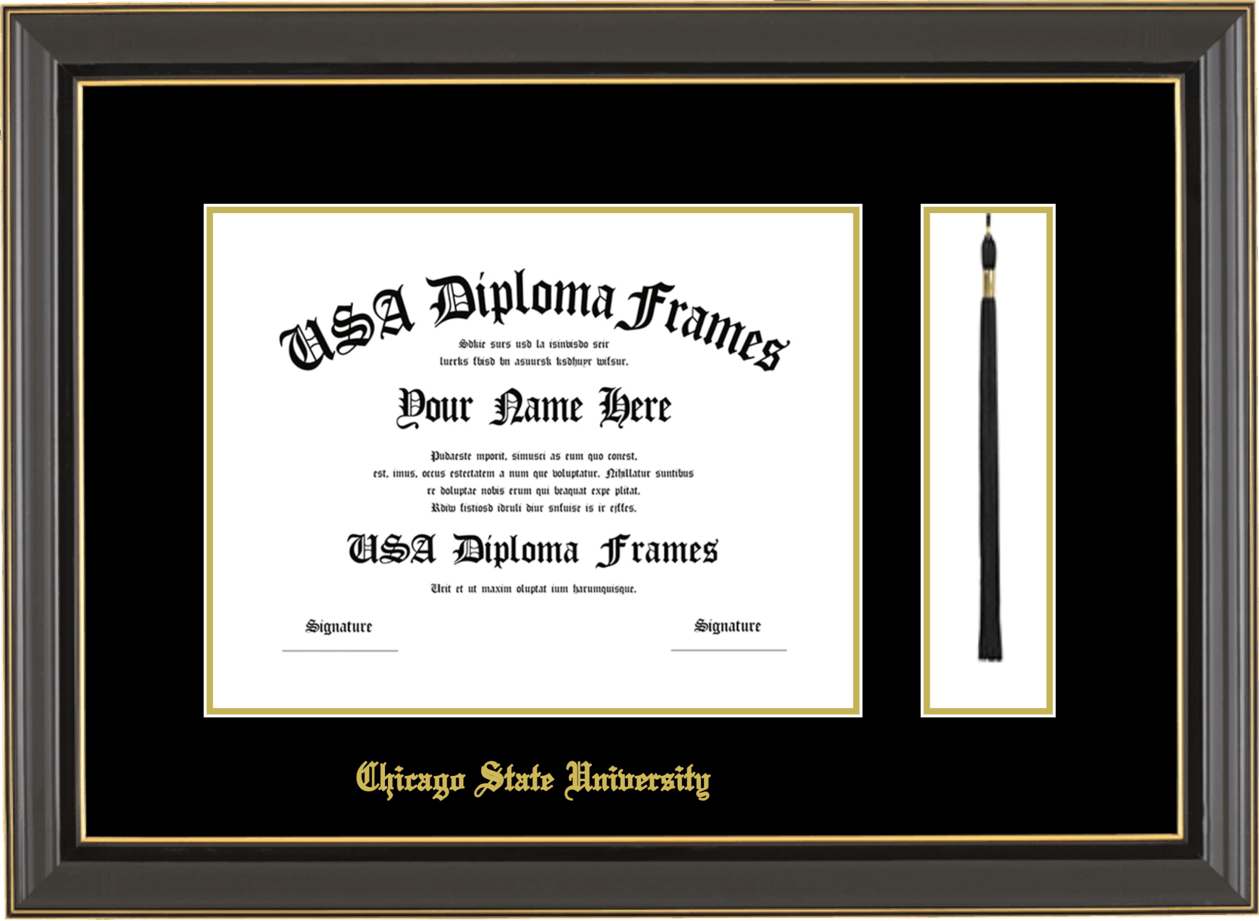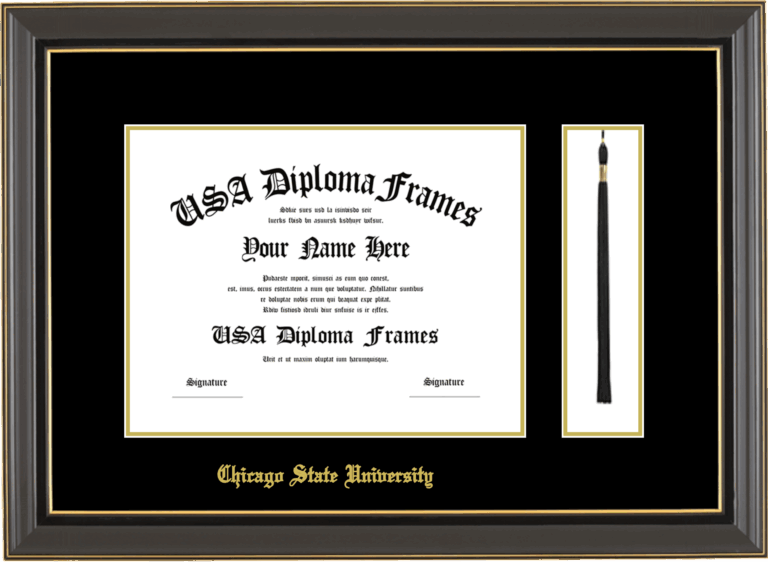 Chicago State University Diploma Frame with Tassel – Black Gold Trim Glossy – Black and Gold Mat