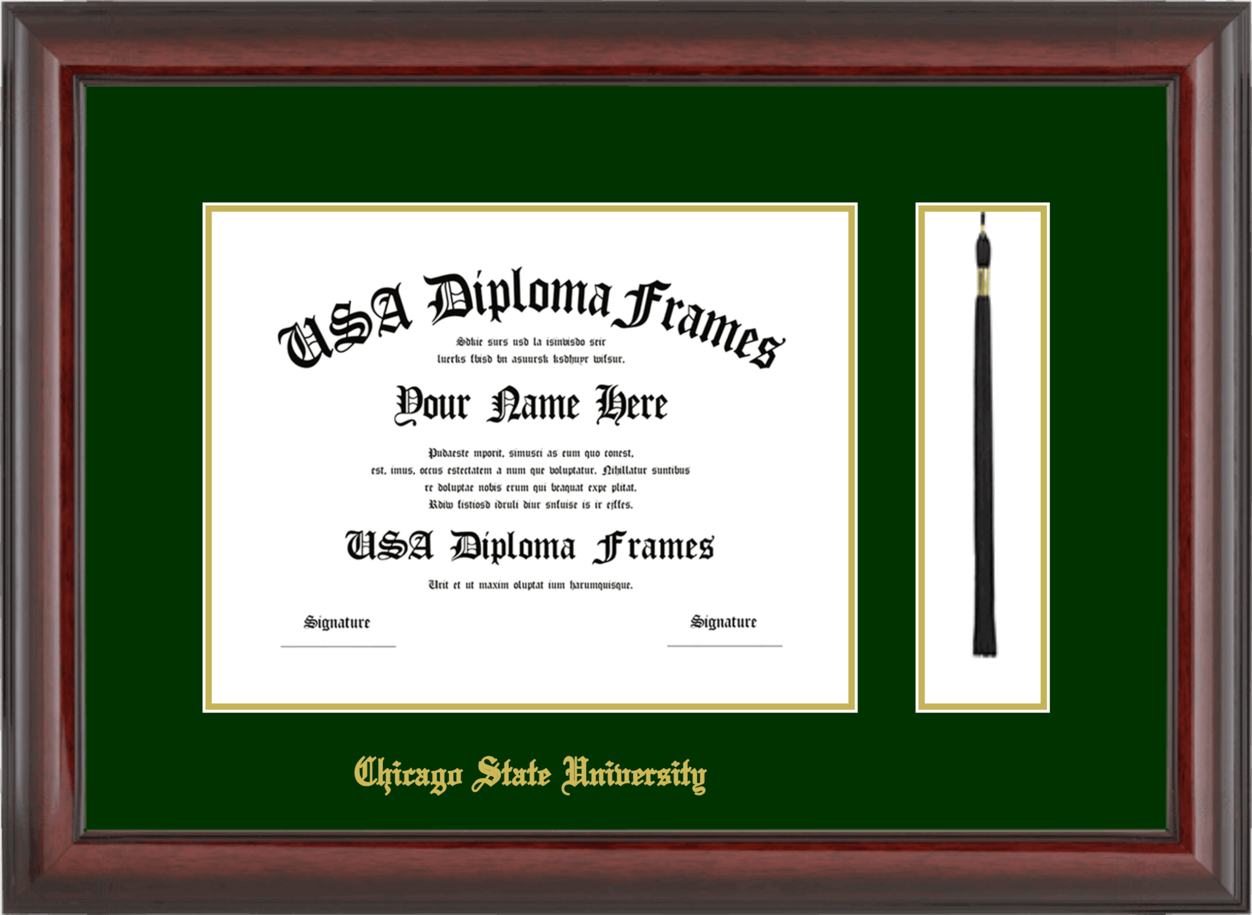 Chicago State University Diploma Frame with Tassel – Cherry Mahogany Glossy – Winter Green and Gold Mat