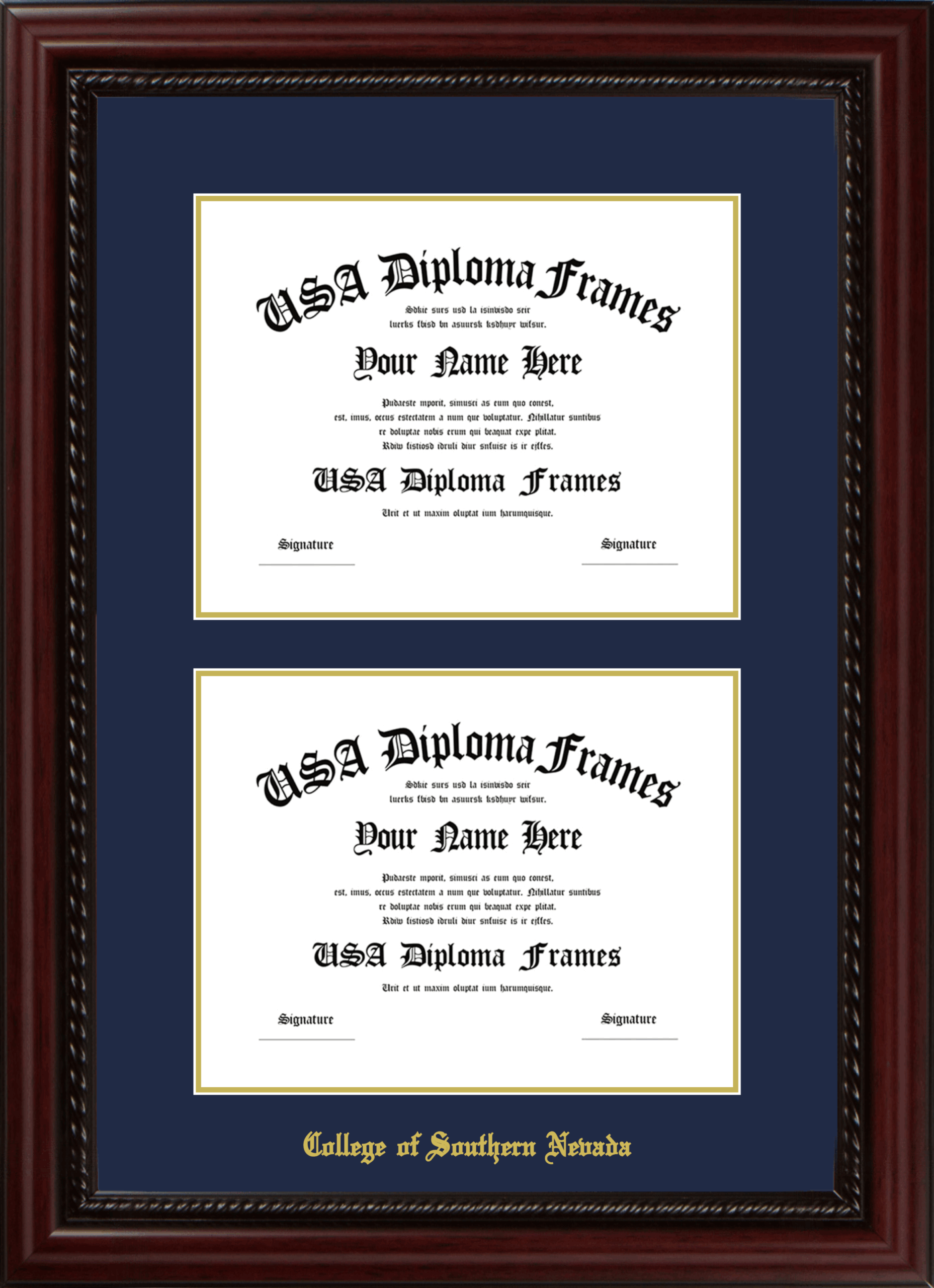 College of Southern Nevada Double Diploma Frame – Double Document – Executive Cherry Rope – Navy and Gold Mat