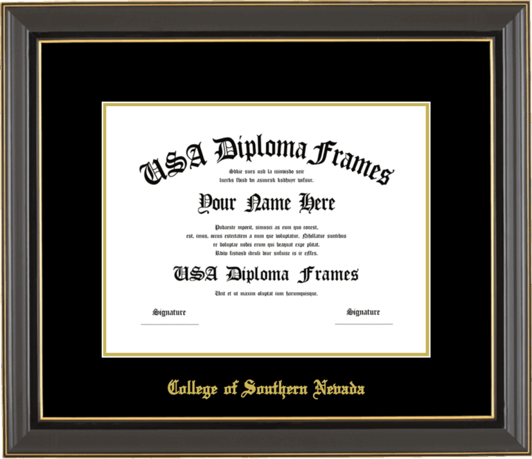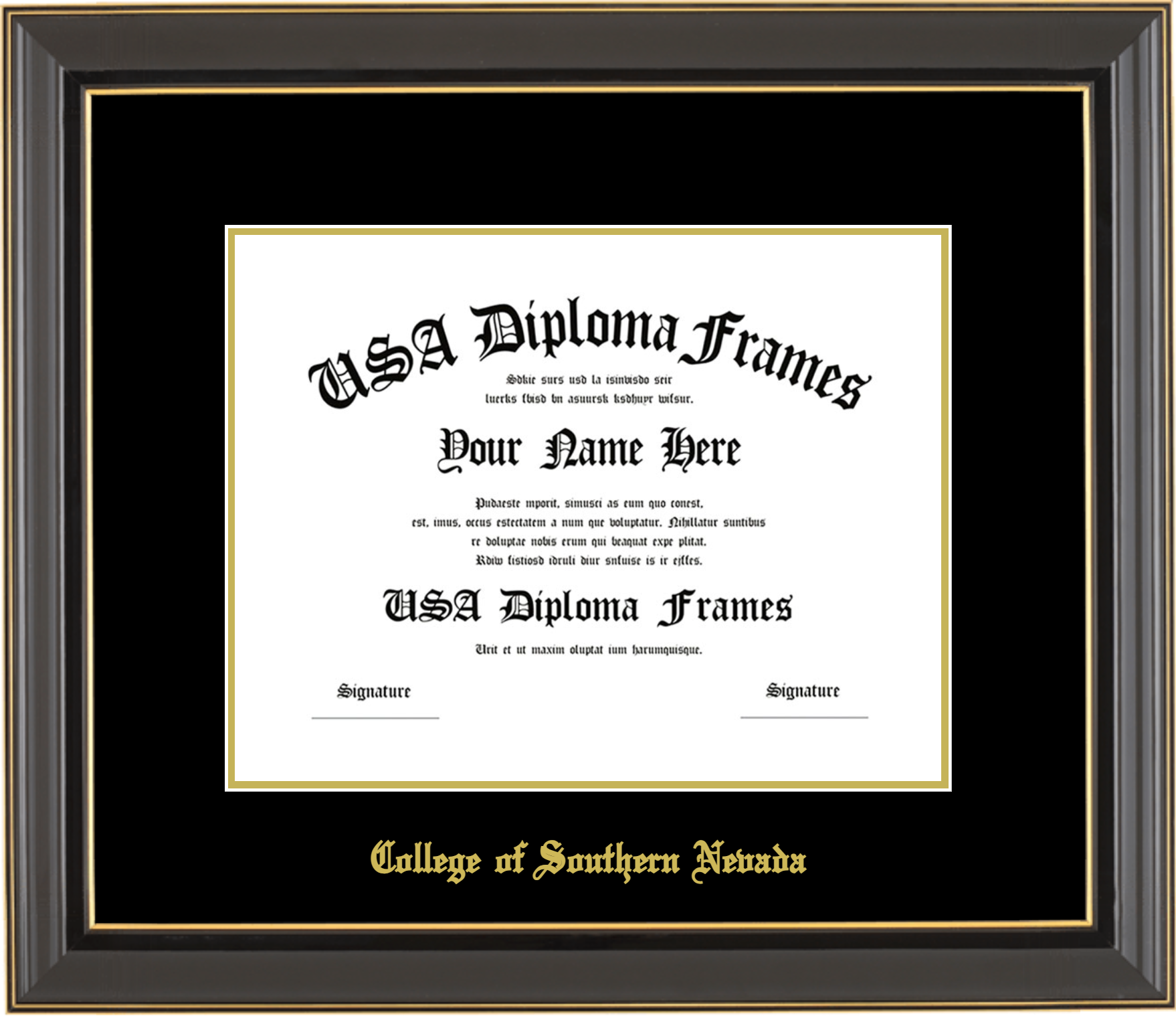 College of Southern Nevada Diploma Frame – Black Gold Trim Glossy – Black and Gold Mat