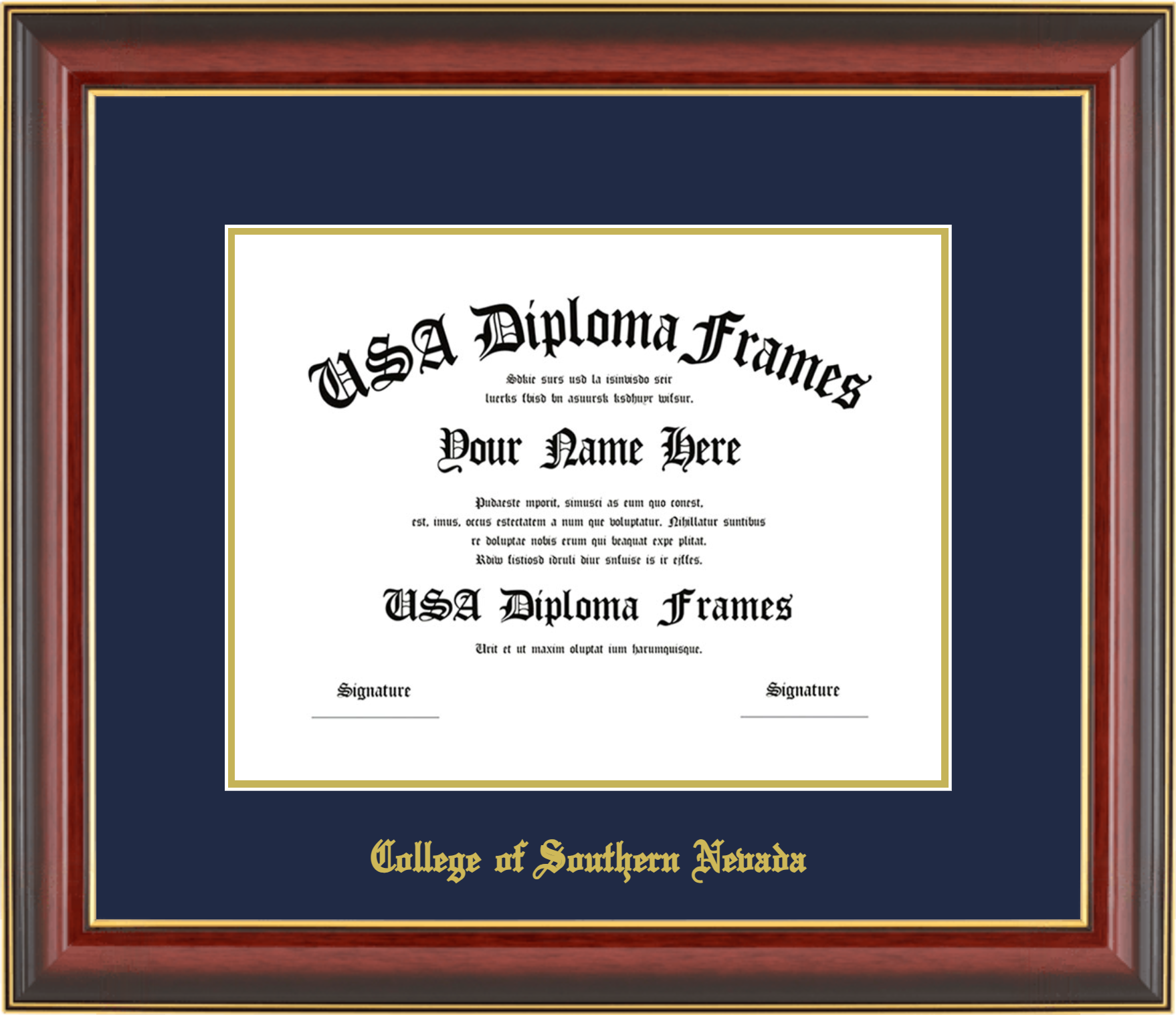 College of Southern Nevada Diploma Frame – Cherry Mahogany Gold Trim Glossy – Navy and Gold Mat