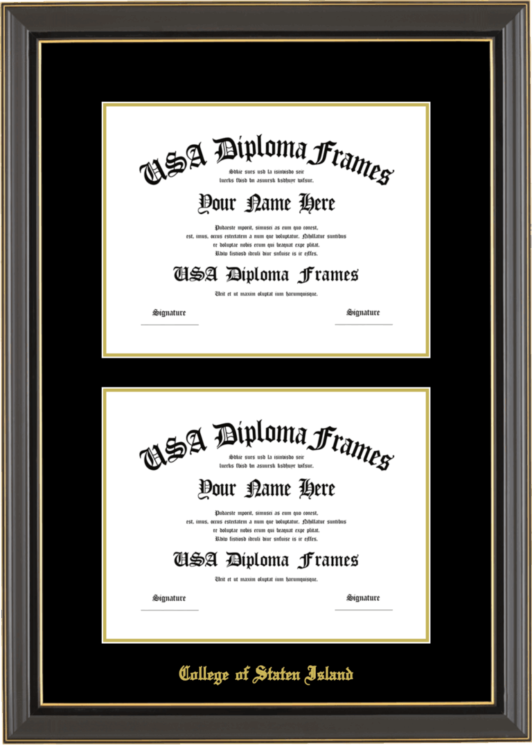 College of Staten Island Double Diploma Frame – Double Document – Black Gold Trim Glossy – Black and Gold Mat