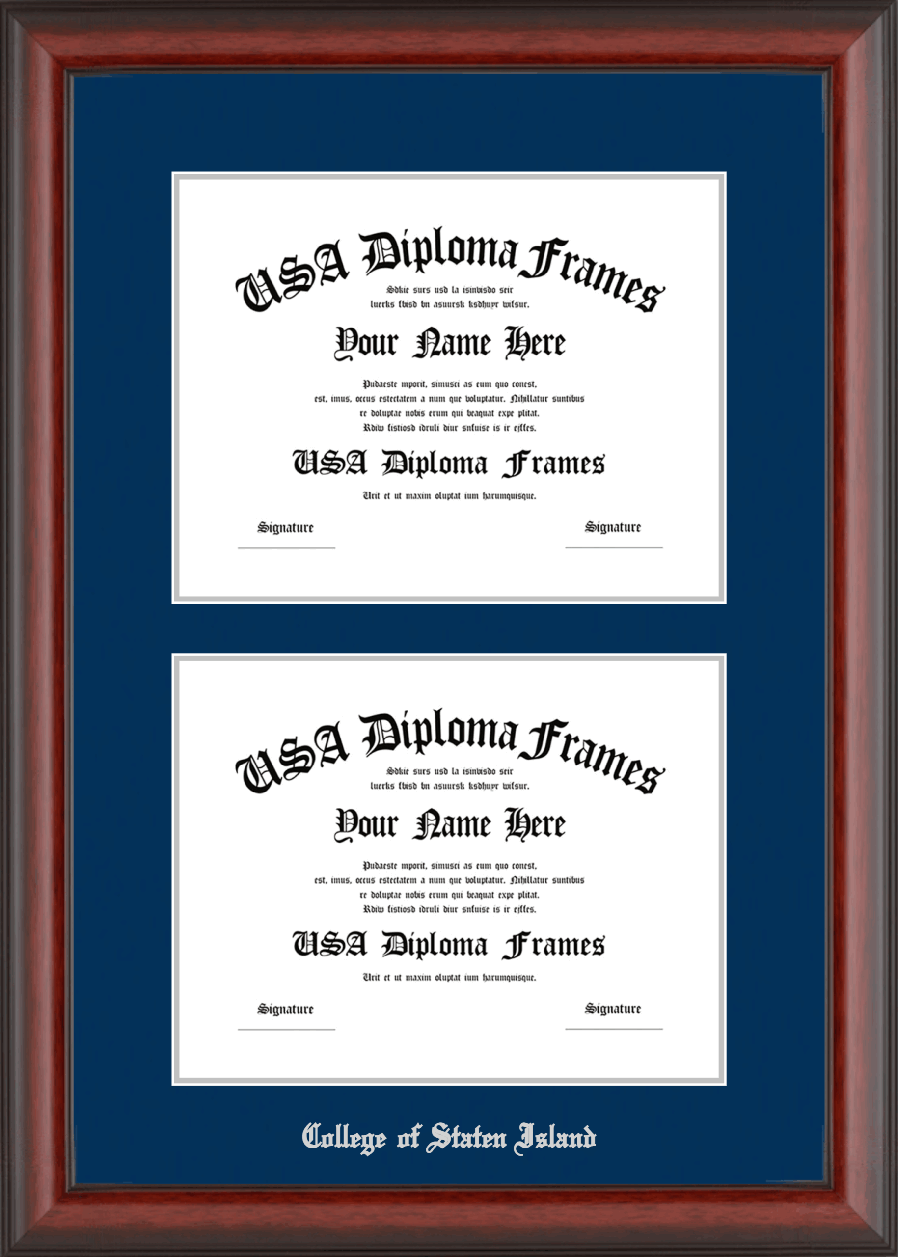 College of Staten Island Double Diploma Frame – Double Document – Cherry Mahogany Matte – Navy and Silver Mat