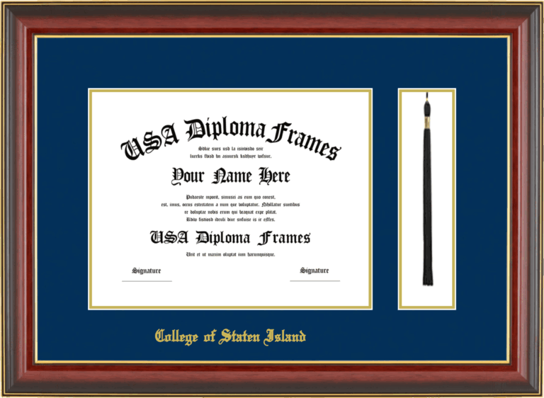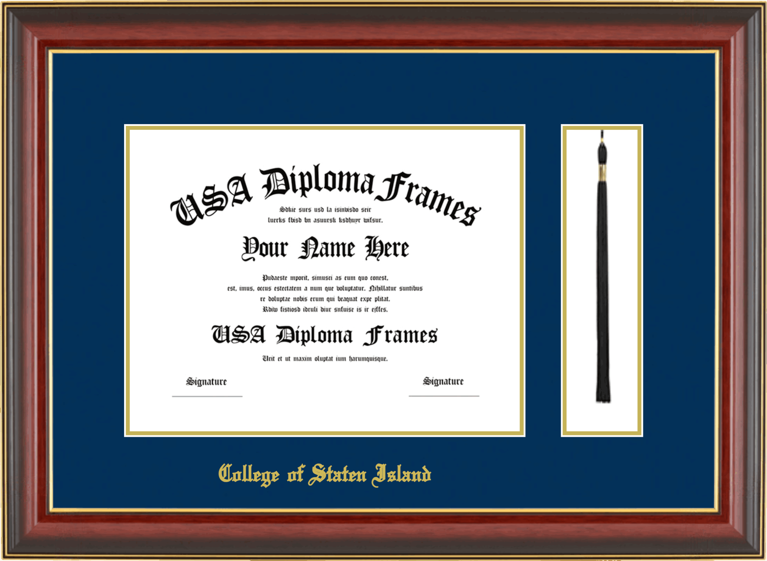College of Staten Island Diploma Frame with Tassel – Cherry Mahogany Gold Trim Glossy – Navy and Gold Mat