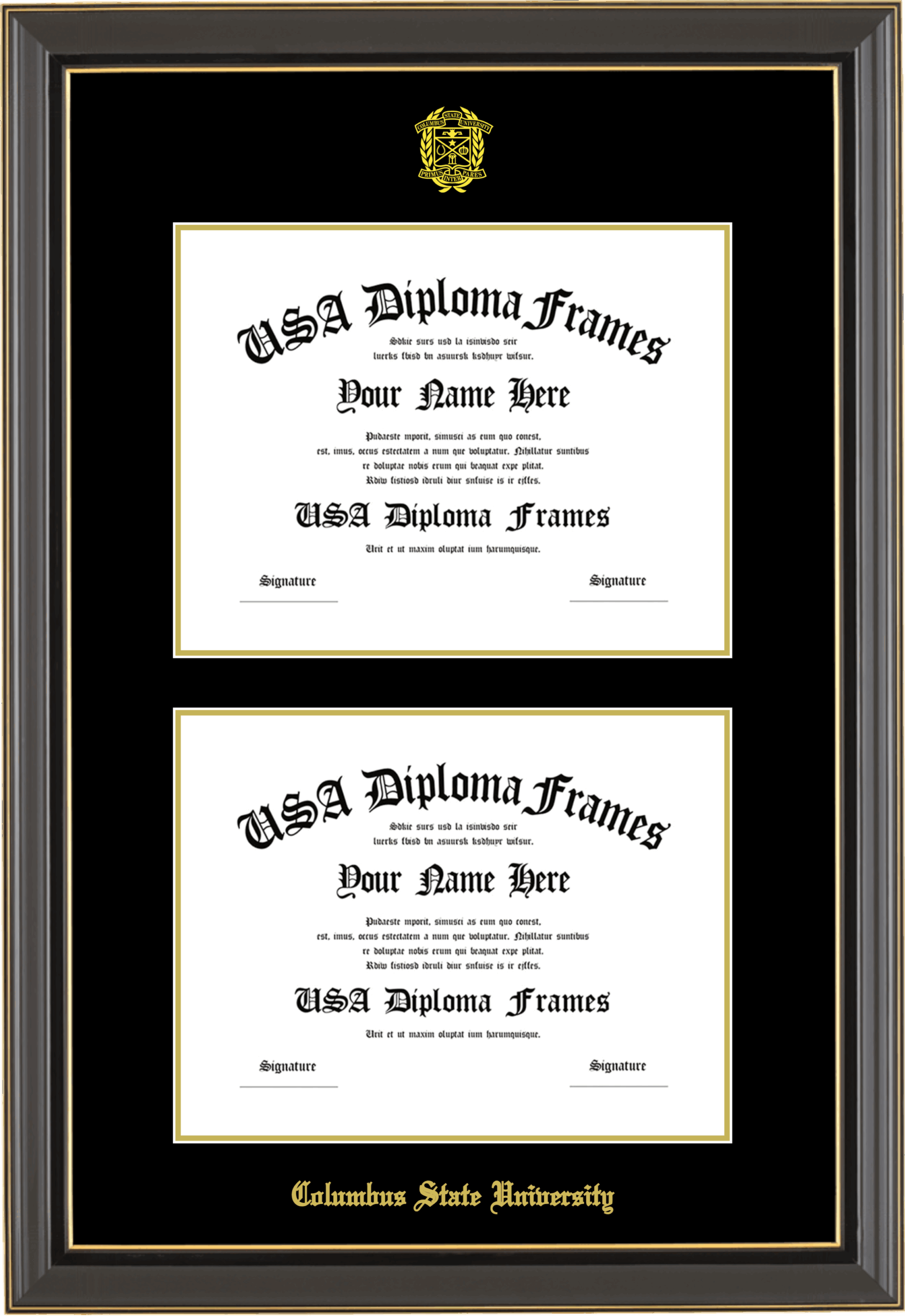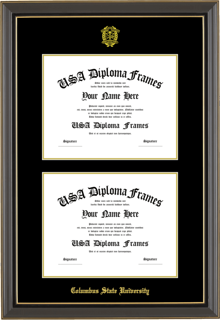 Columbus State University Double Diploma Frame – Double Document – Black Gold Trim Glossy – Black and Gold Mat