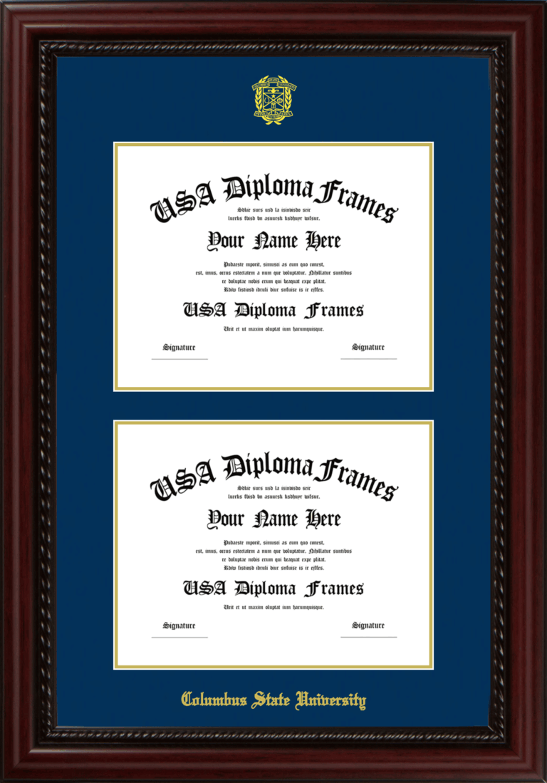 Columbus State University Double Diploma Frame – Double Document – Executive Cherry Rope – Navy and Gold Mat