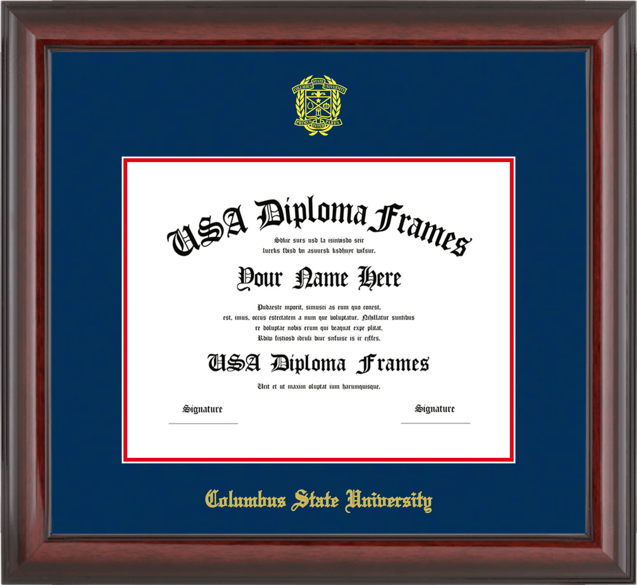 Columbus State University Diploma Frame – Cherry Mahogany Glossy – Navy and Red Mat