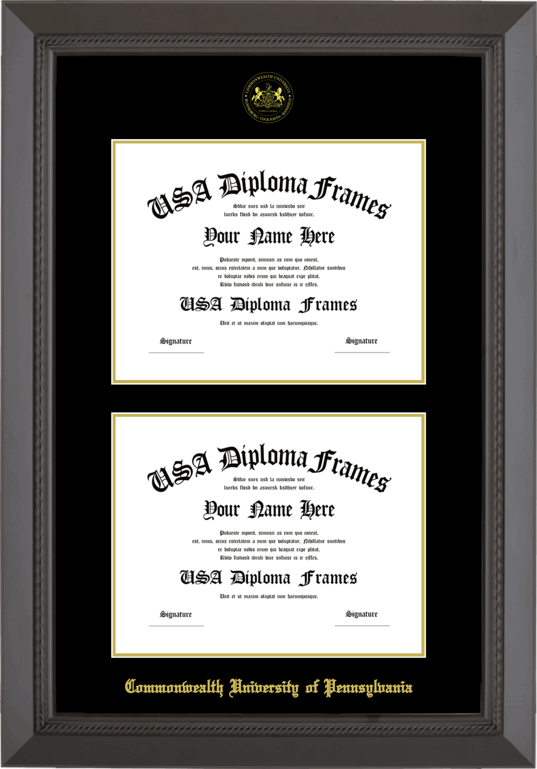 Commonwealth University of Pennsylvania Double Diploma Frame – Double Document – Black Rope – Black and Gold Mat