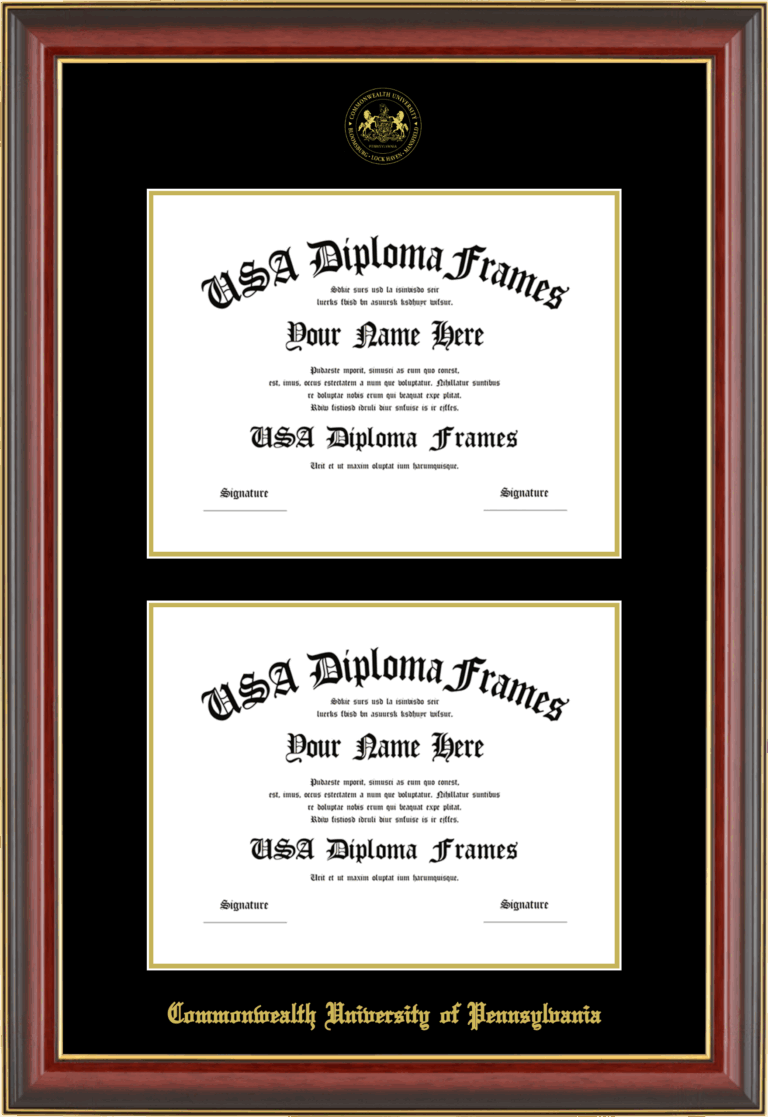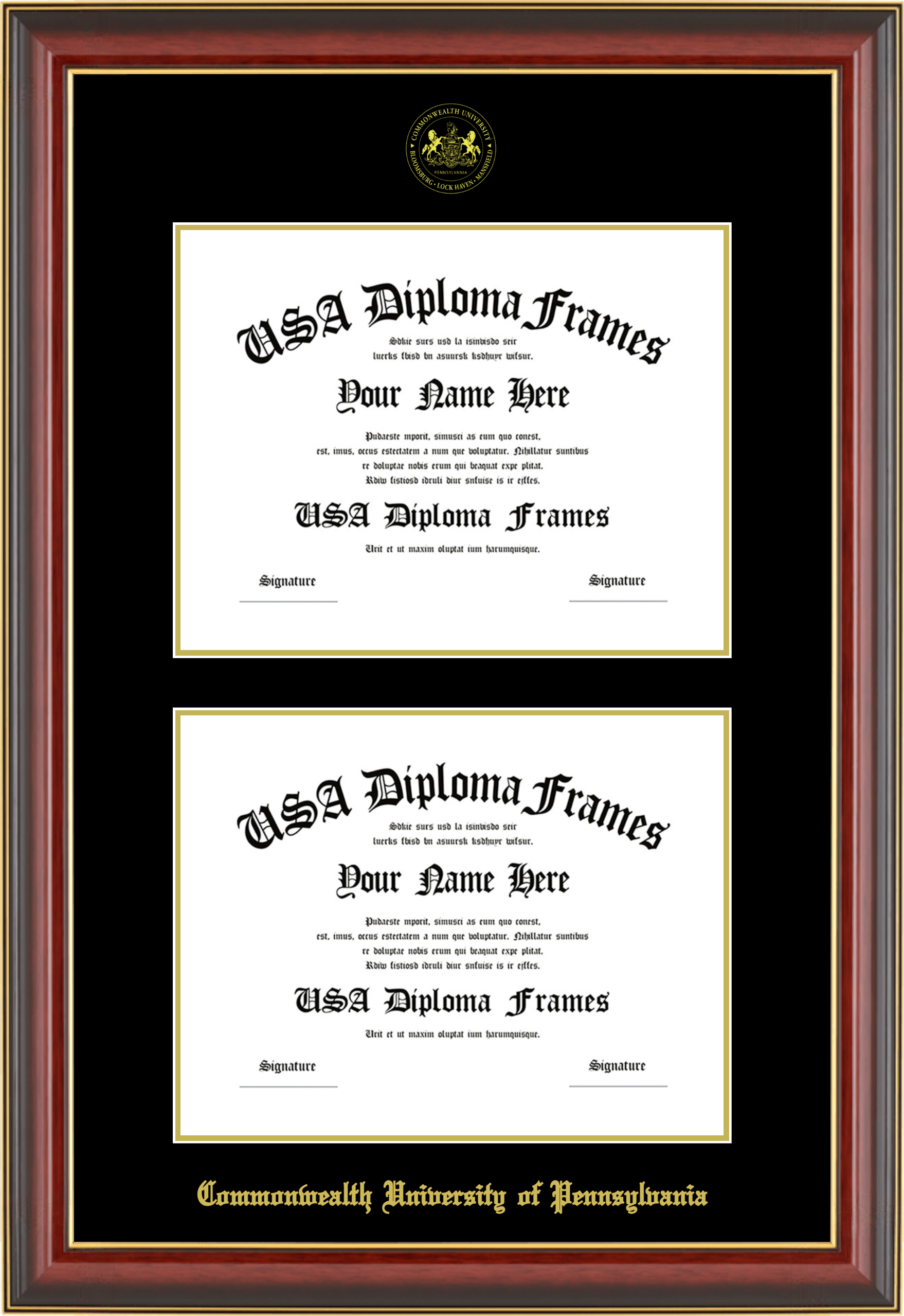 Commonwealth University of Pennsylvania Double Diploma Frame – Double Document – Cherry Mahogany Gold Trim Glossy – Black and Gold Mat