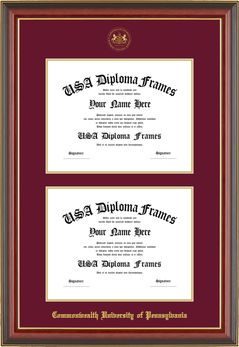 Commonwealth University of Pennsylvania Double Diploma Frame – Double Document – Cherry Mahogany Gold Trim Glossy – Maroon and Gold Mat