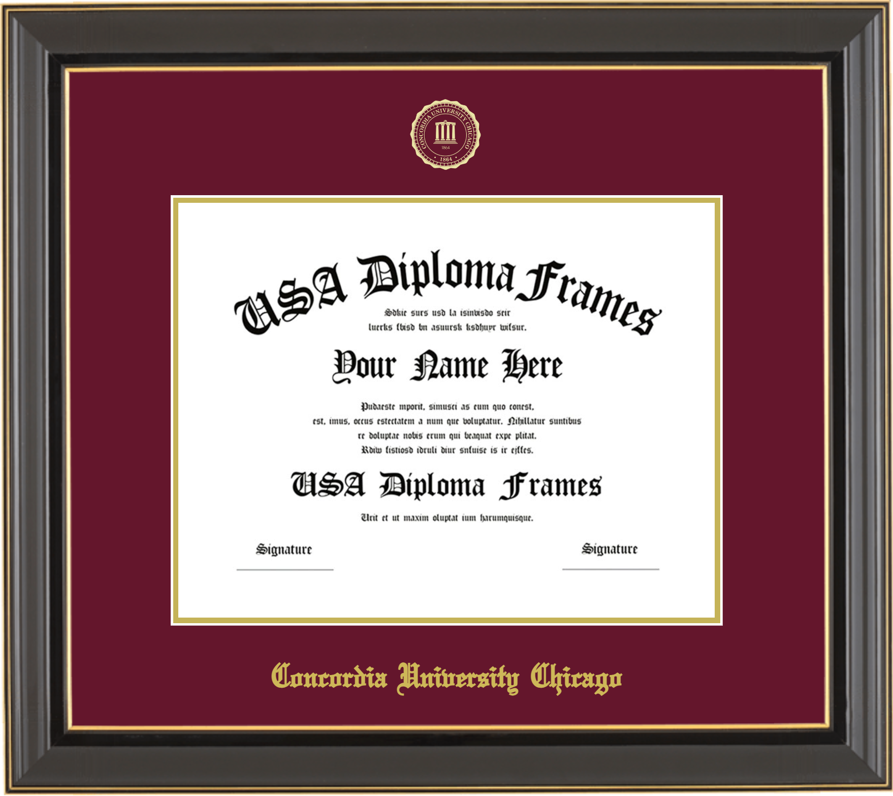 Concordia University Chicago – Single Horizontal Document ( Diploma ) – Black Gold Trim Glossy – Maroon Mat – Gold Accent Mat – With Seal(University Seal Gold) – With Gold Embossing (Concordia University Chicago)