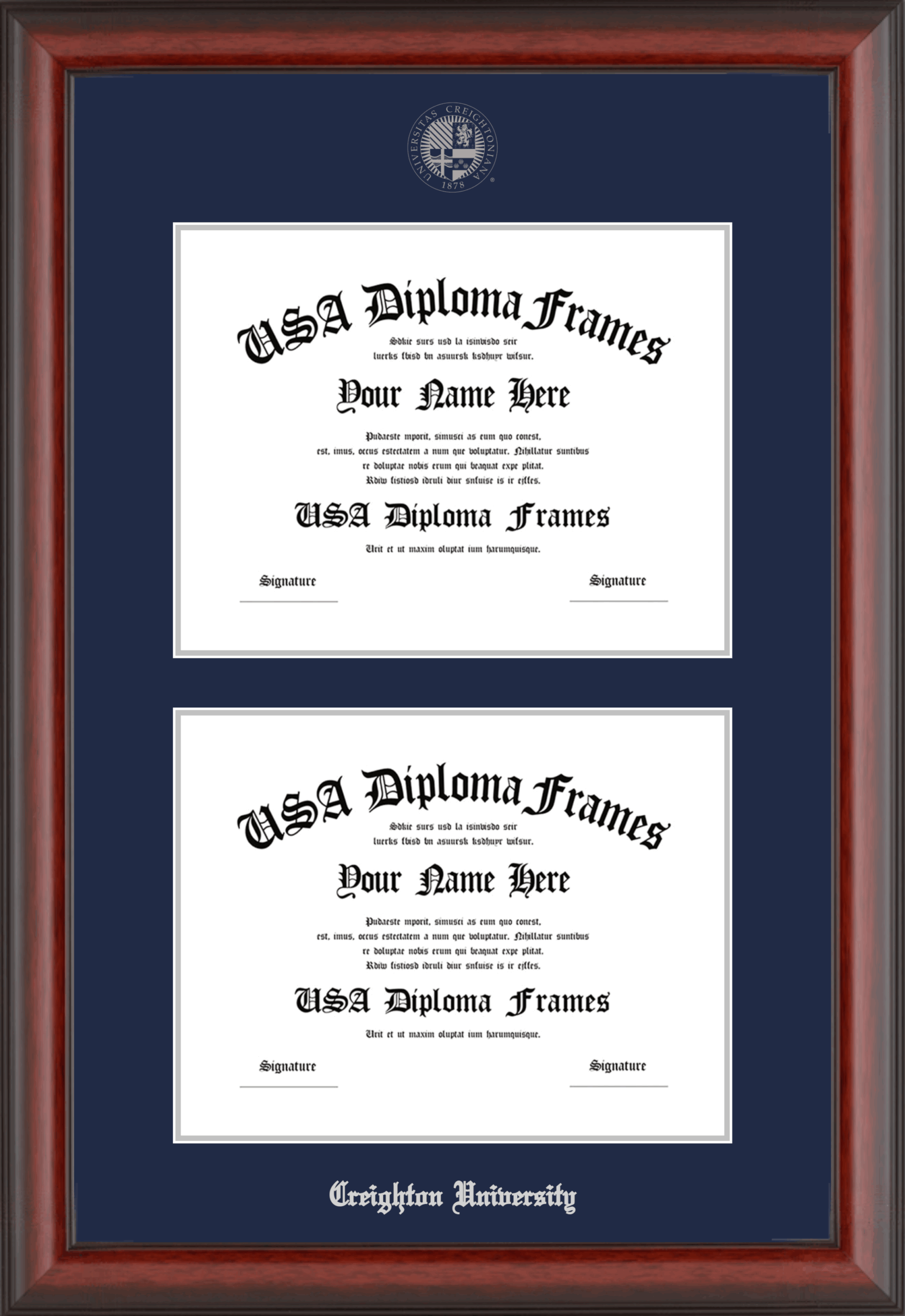 Creighton University – Double Document Vertically ( 8 1/2″x11″ , 8 1/2″x11″ ) – Cherry Mahogany Matte – Navy Mat – Silver Accent Mat – With Seal(University Seal Silver) – With Silver Embossing (Creighton University)