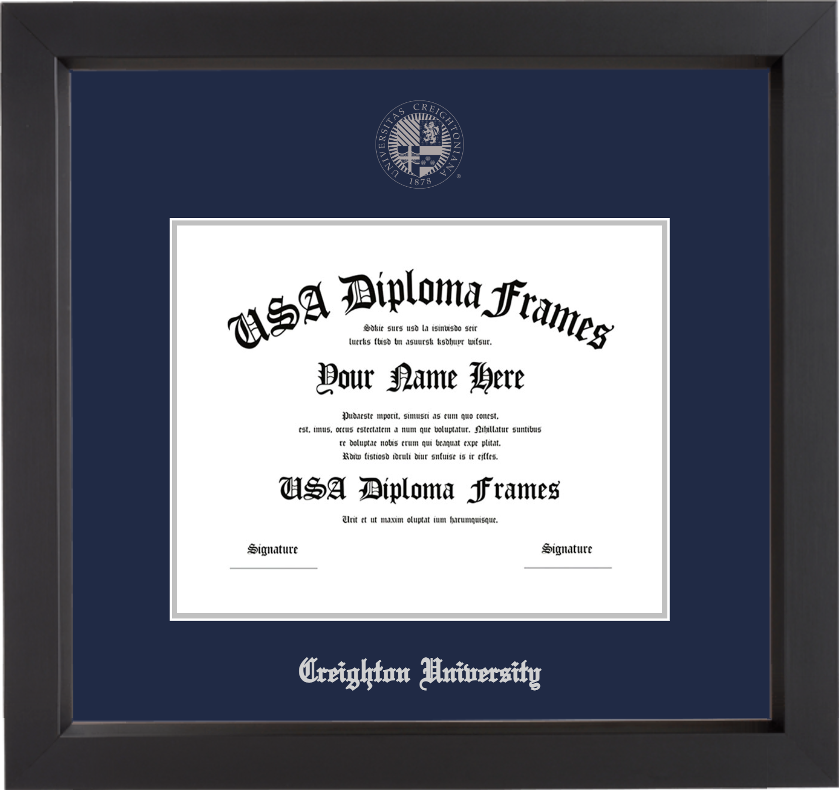 Creighton University – Single Horizontal Document ( Bachelors ) – Black Matte – Navy Mat – Silver Accent Mat – With Seal(University Seal Silver) – With Silver Embossing (Creighton University)