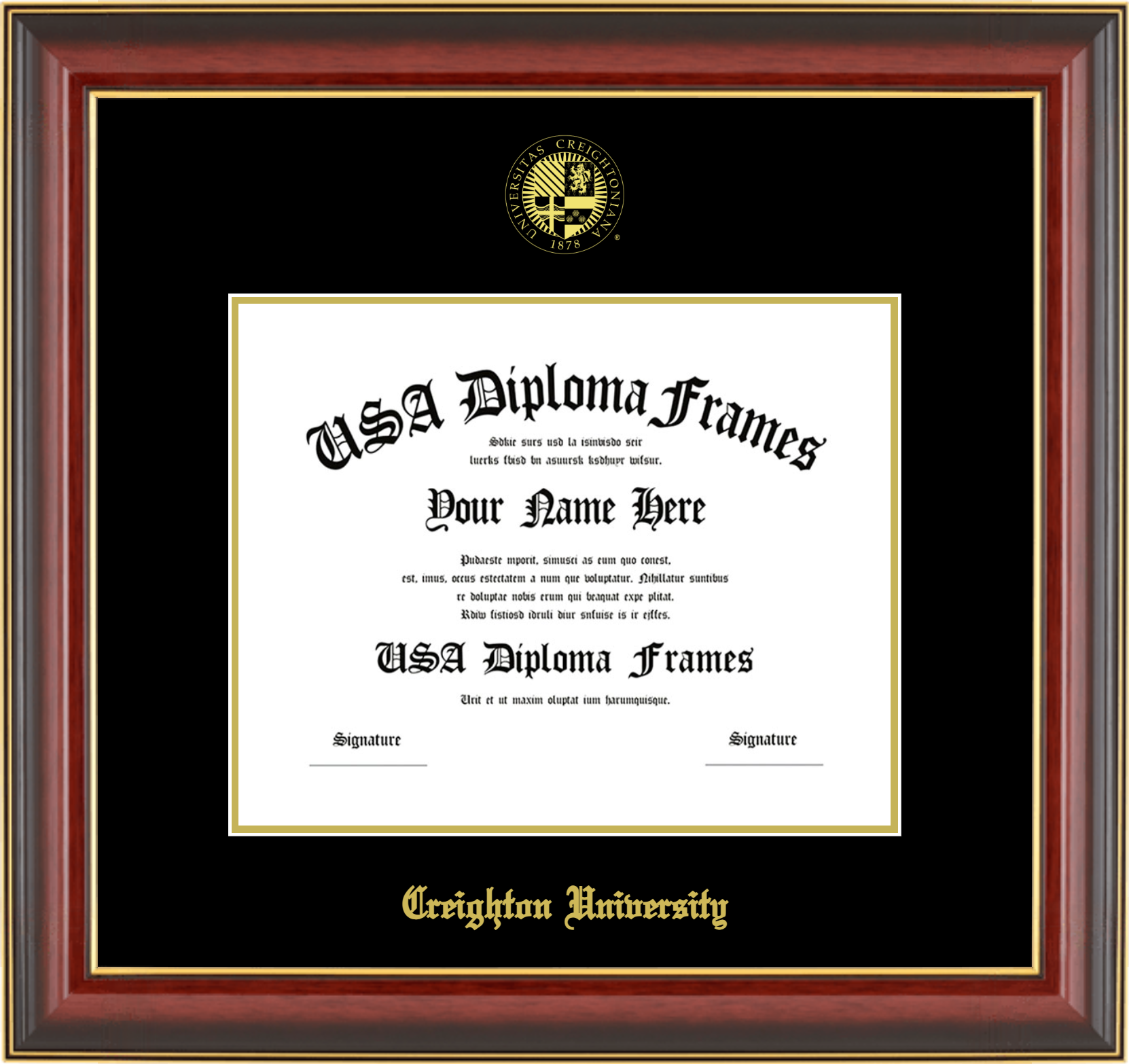Creighton University – Single Horizontal Document ( Bachelors ) – Cherry Mahogany Gold Trim Glossy – Black Mat – Gold Accent Mat – With Seal(University Seal Gold) – With Gold Embossing (Creighton University)