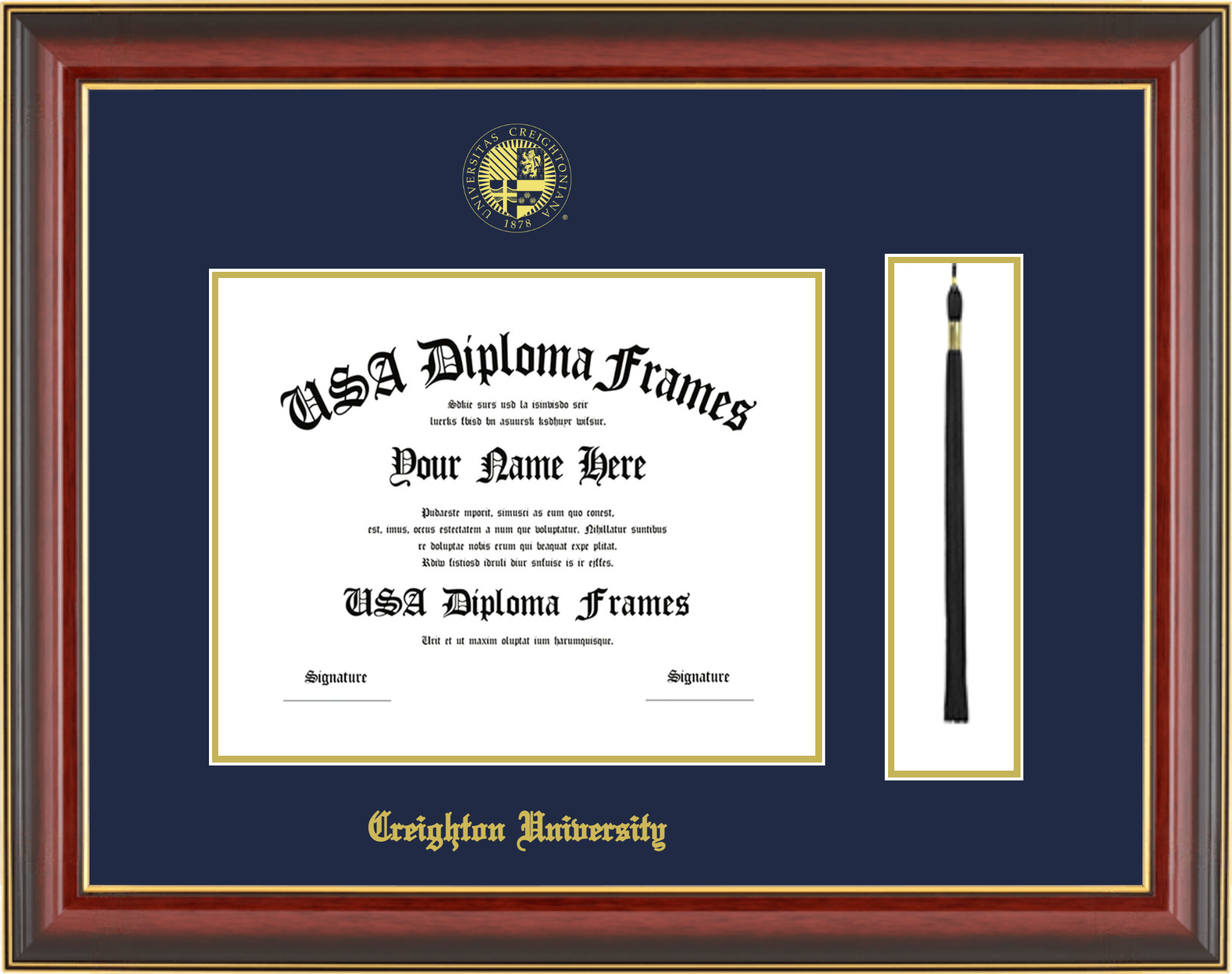 Creighton University – Single Horizontal Document ( Bachelors ) – Cherry Mahogany Gold Trim Glossy – Navy Mat – Gold Accent Mat – With Tassel(Default) – With Seal(University Seal Gold) – With Gold Embossing (Creighton University)