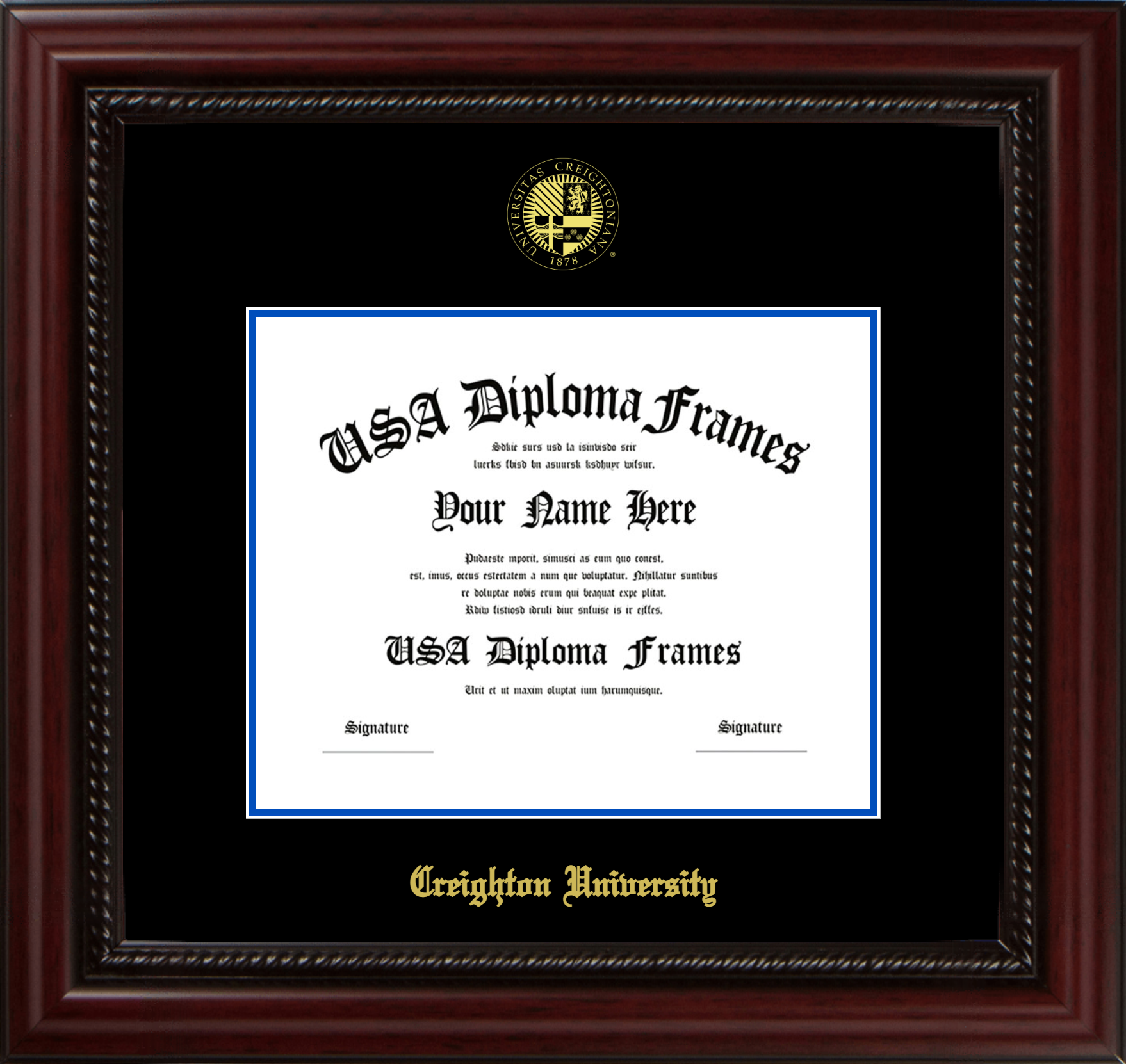 Creighton University – Single Horizontal Document ( Bachelors ) – Executive Cherry Rope – Black Mat – Royal Blue Accent Mat – With Seal(University Seal Gold) – With Gold Embossing (Creighton University)