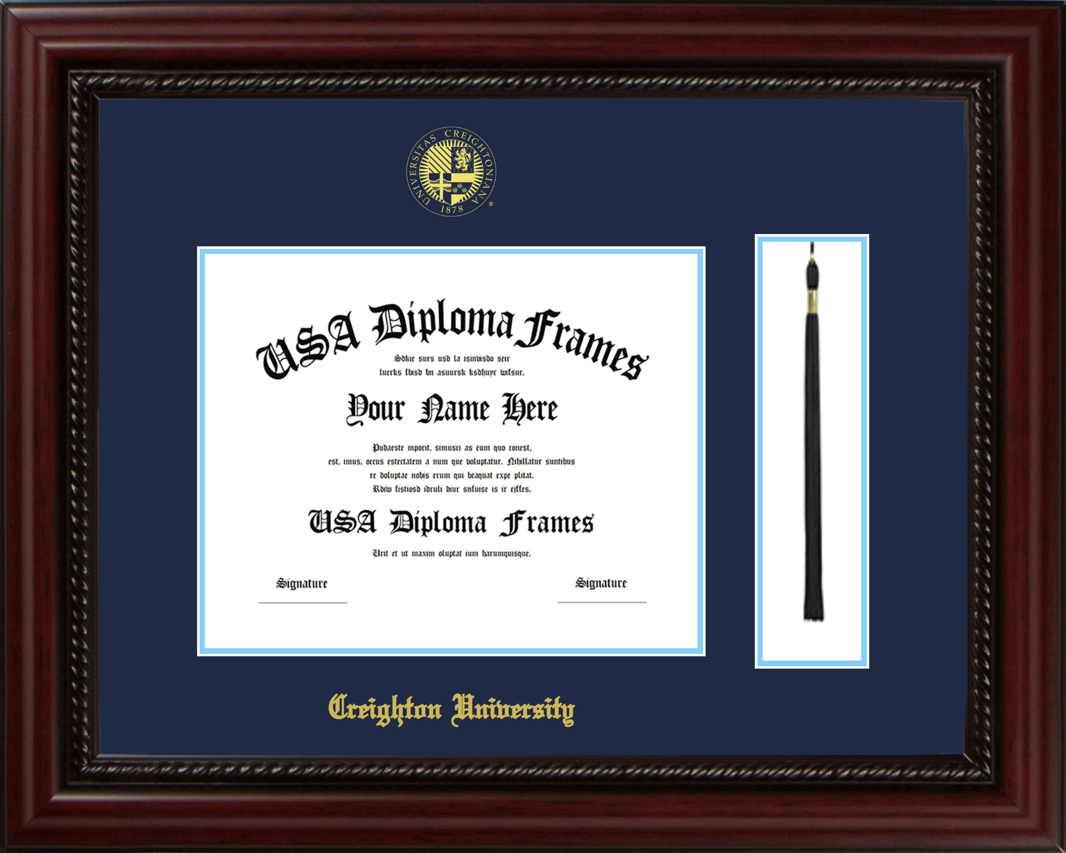 Creighton University – Single Horizontal Document ( Bachelors ) – Executive Cherry Rope – Navy Mat – Light Blue Accent Mat – With Tassel(Default) – With Seal(University Seal Gold) – With Gold Embossing (Creighton University)