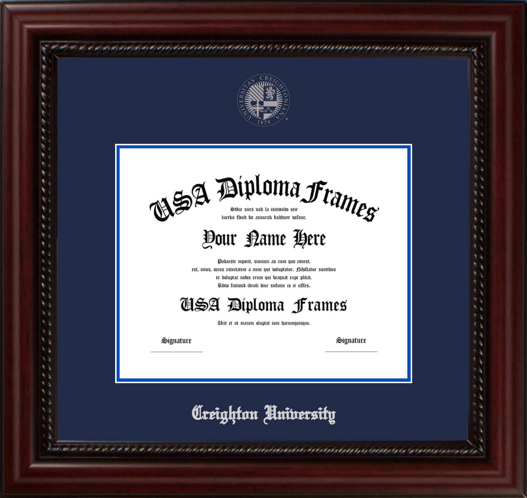 Creighton University – Single Horizontal Document ( Bachelors ) – Executive Cherry Rope – Navy Mat – Royal Blue Accent Mat – With Seal(University Seal Silver) – With Silver Embossing (Creighton University)