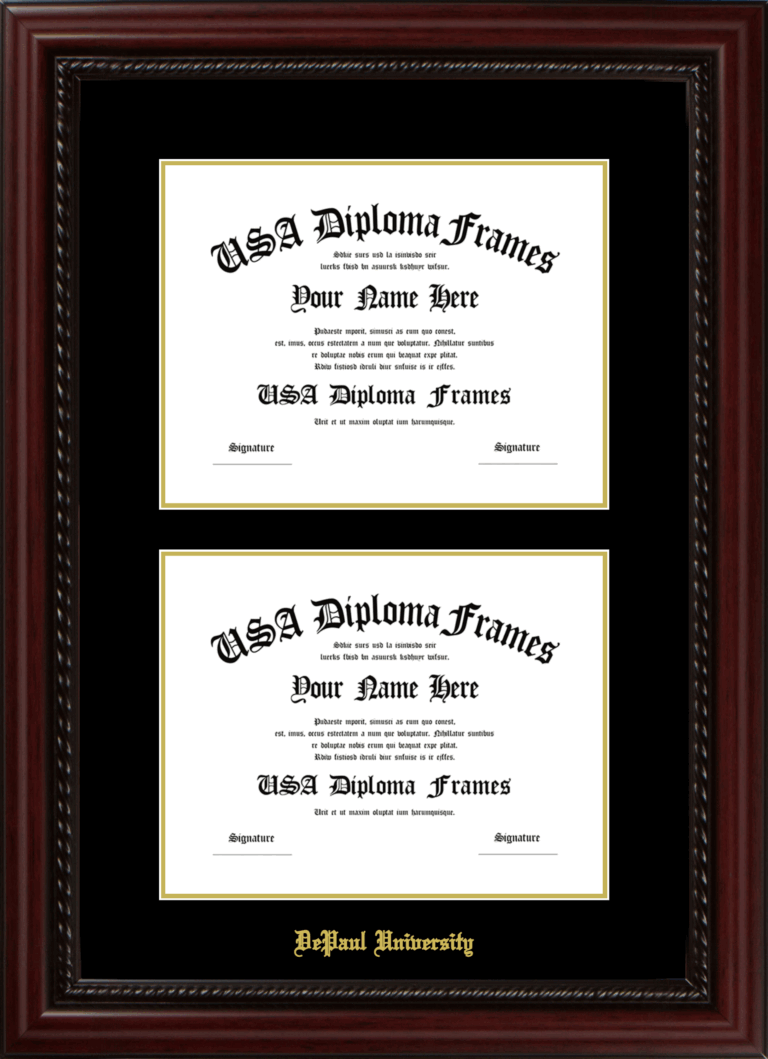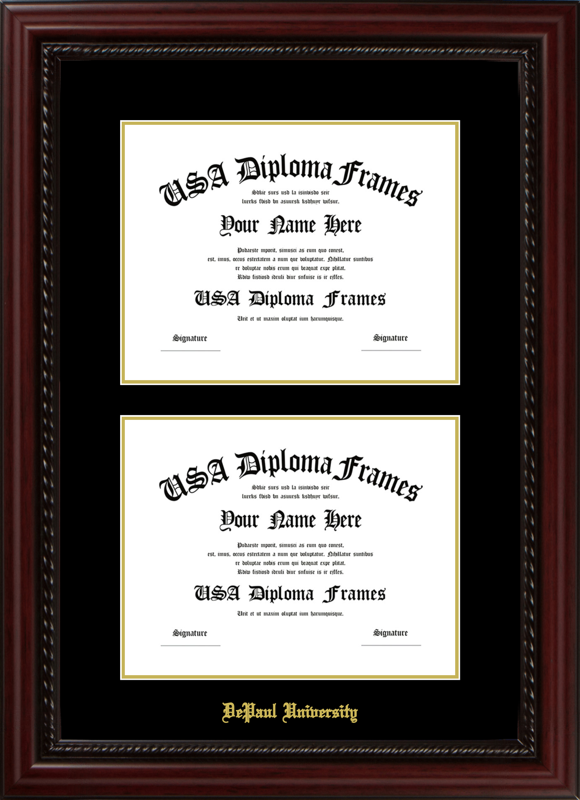 DePaul University Double Diploma Frame – Double Document – Executive Cherry Rope – Black and Gold Mat