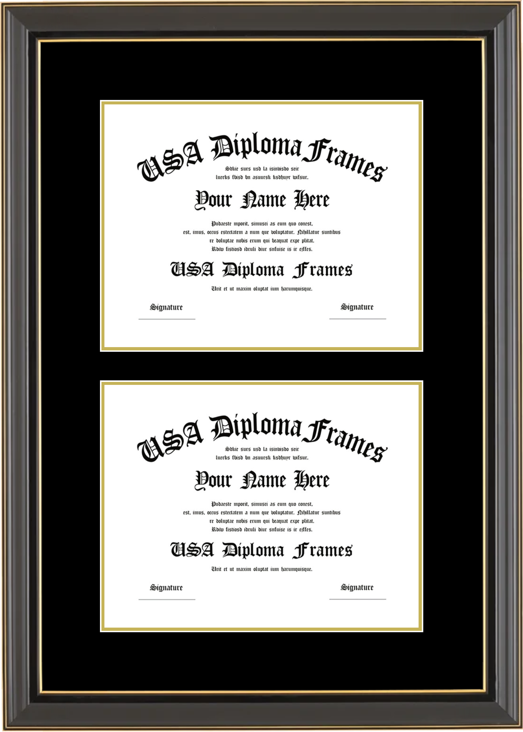 Double Diploma Frame – Black Gold Trim Glossy – Black and Gold Mats – 8.5 x 11 Diplomas