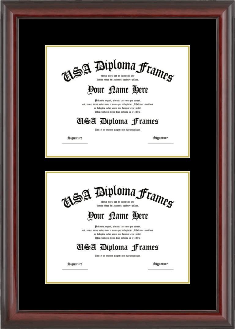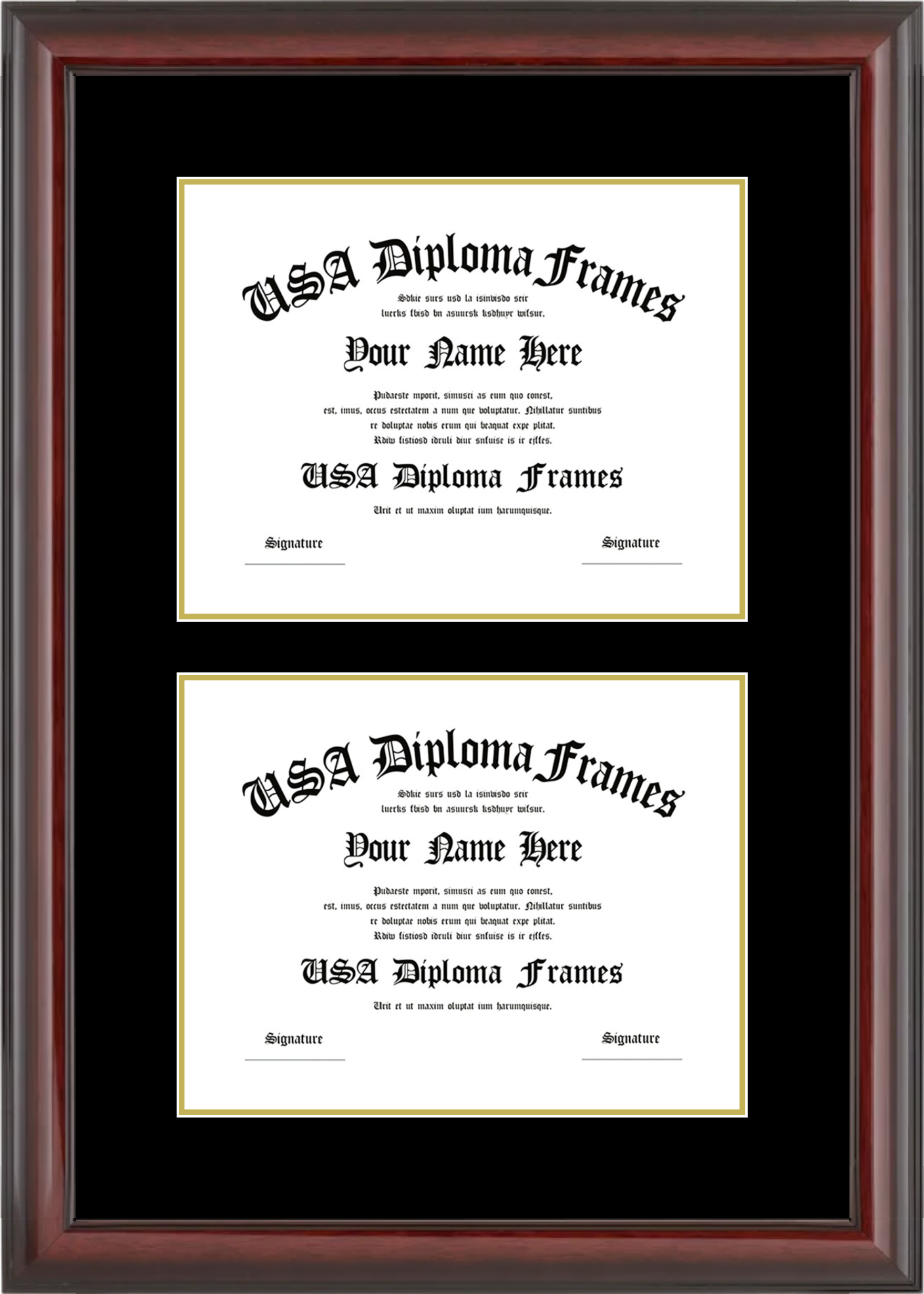 Double Diploma Frame – Cherry Mahogany Glossy – Black and Gold Mat – 8.5 x 11 Diplomas