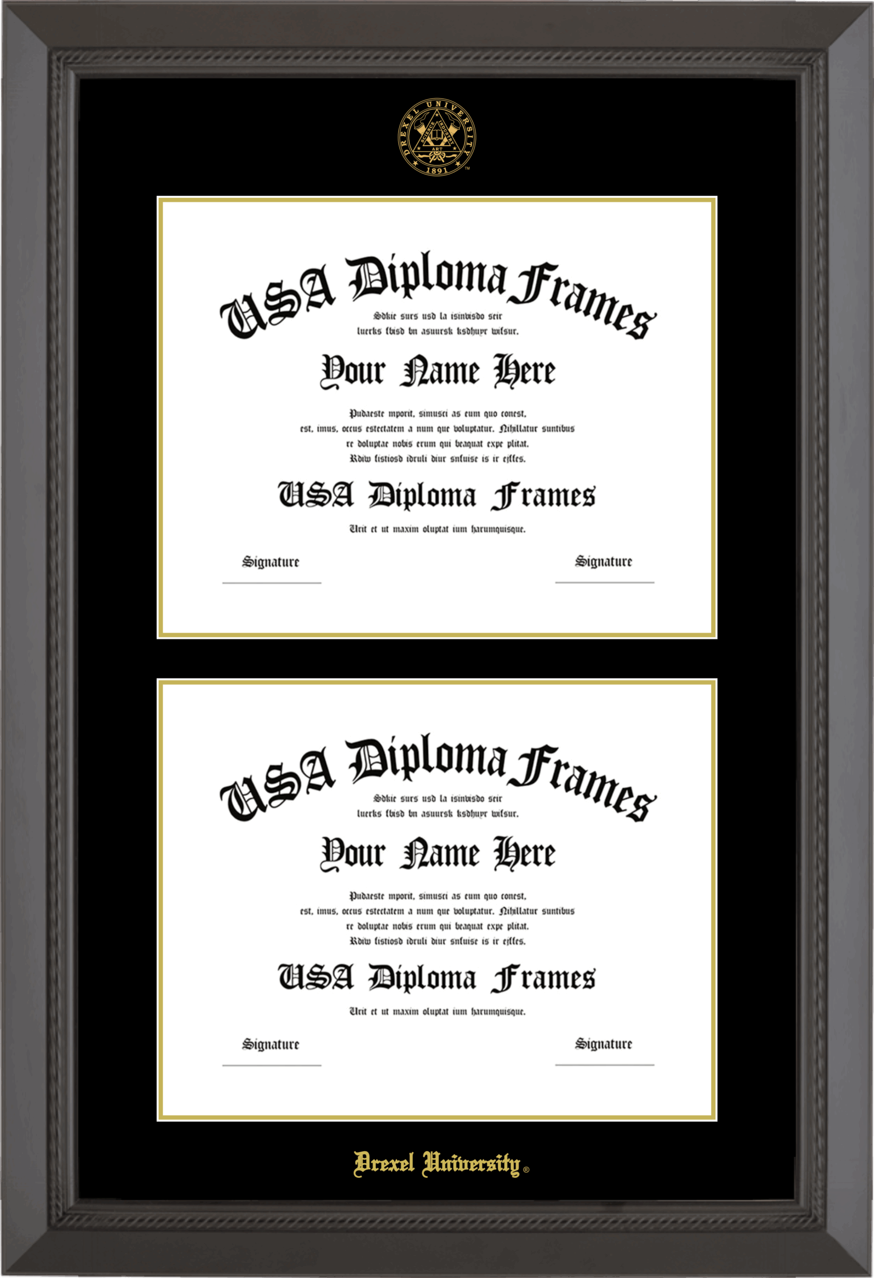 Drexel University Double Diploma Frame – Double Document – Black Rope – Black and Gold Mat