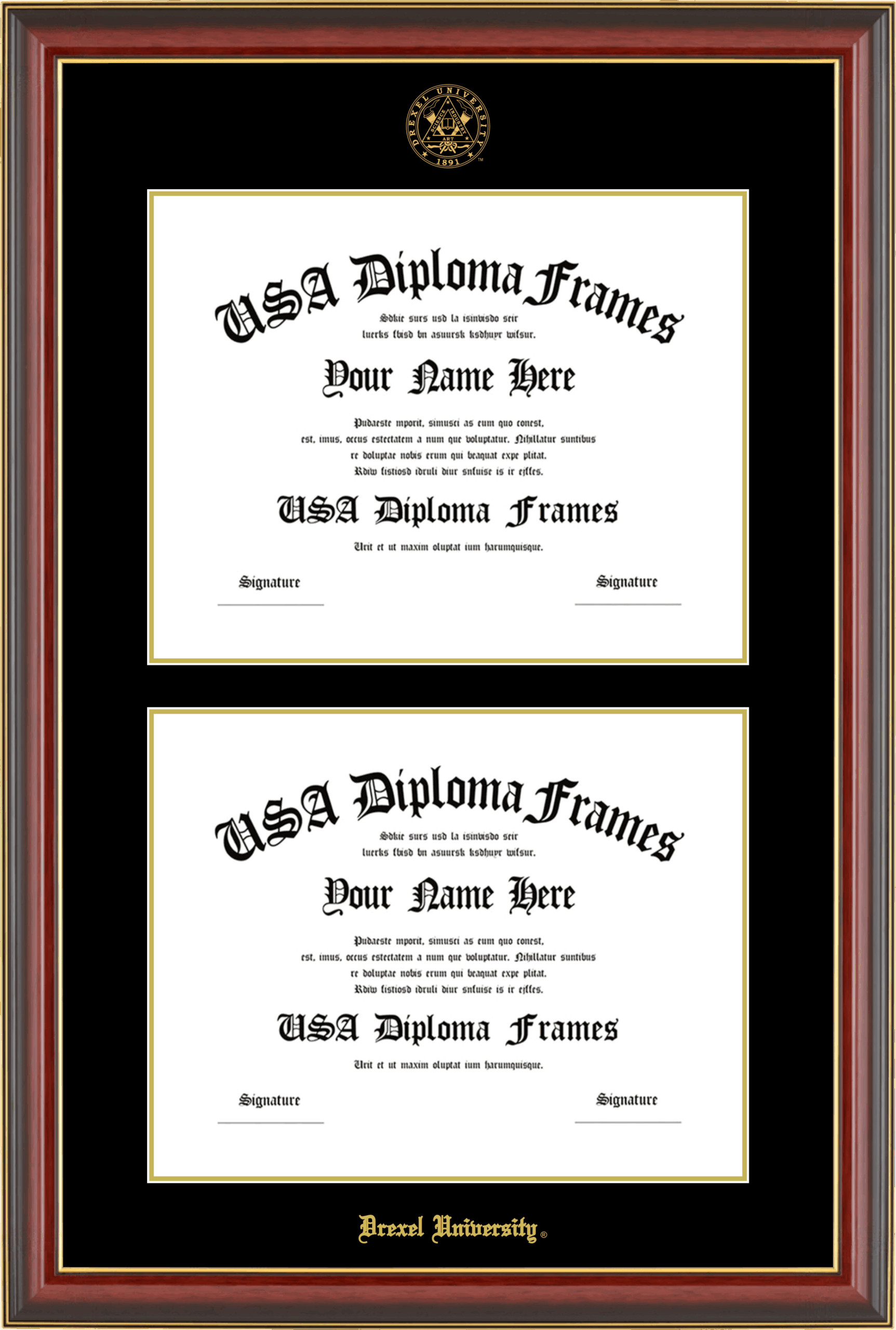 Drexel University Double Diploma Frame – Double Document – Cherry Mahogany Gold Trim Glossy – Black and Gold Mat