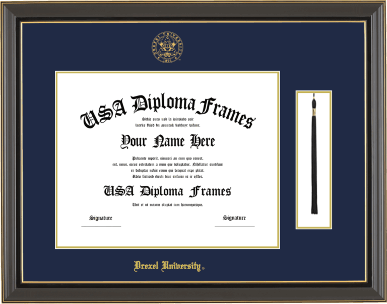 Drexel University Diploma Frame with Tassel- Black Gold Trim Glossy – Navy and Gold Mat