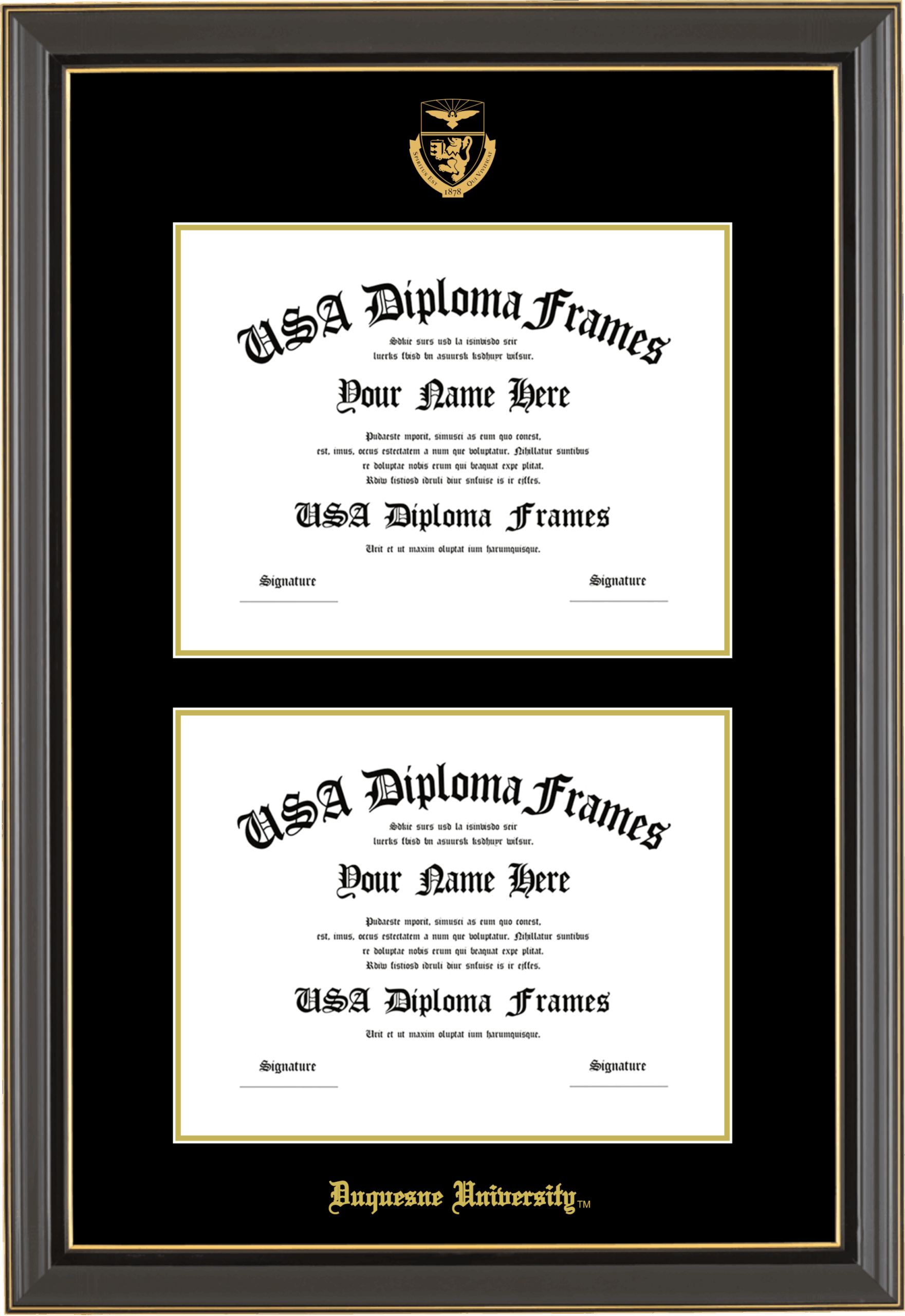 Duquesne University Double Diploma Frame – Double Document – Black Gold Trim Glossy – Black and Gold Mat