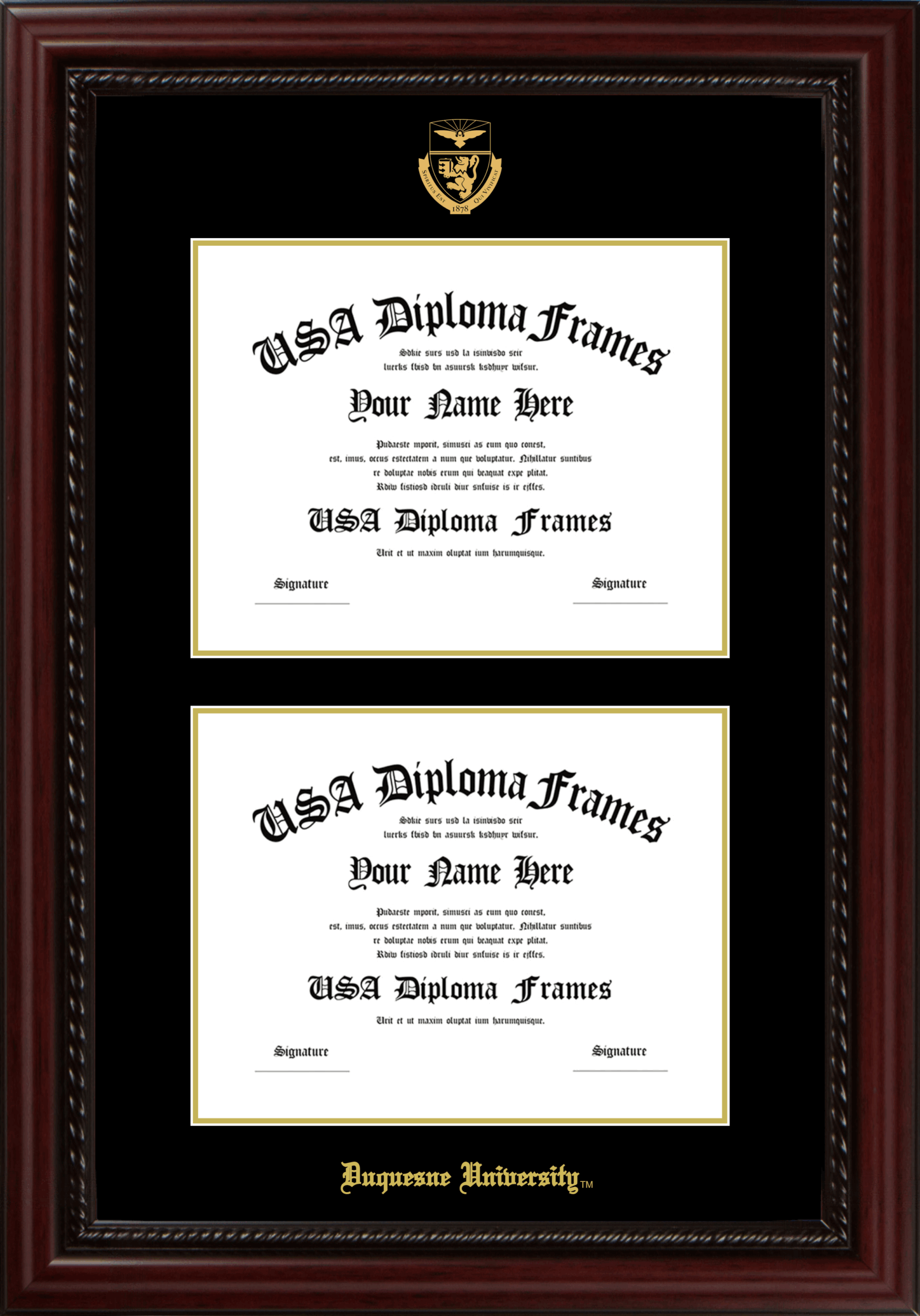Duquesne University Double Diploma Frame – Double Document – Executive Cherry Rope – Black and Gold Mat