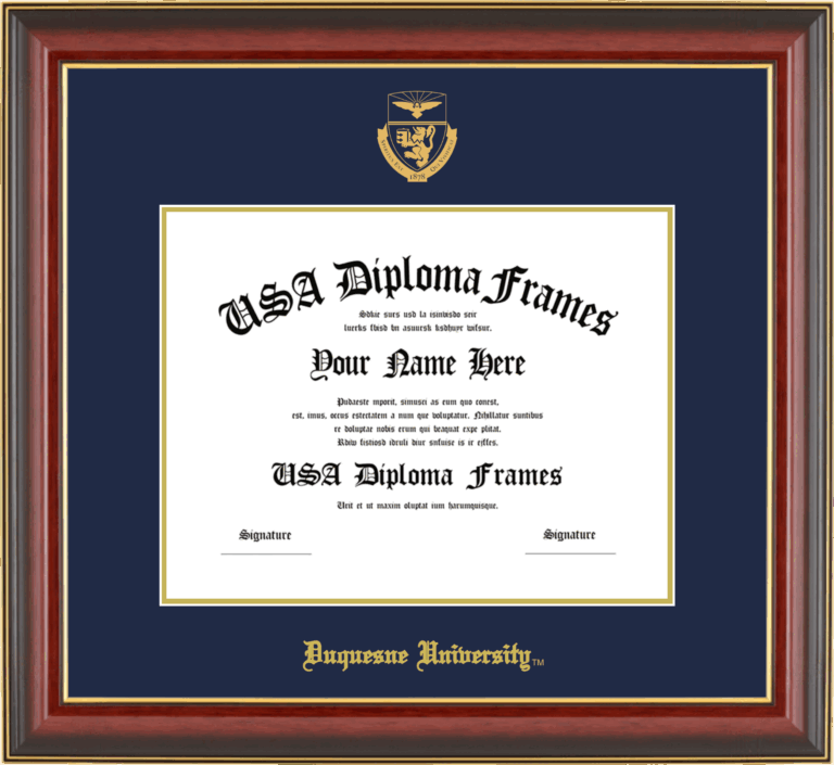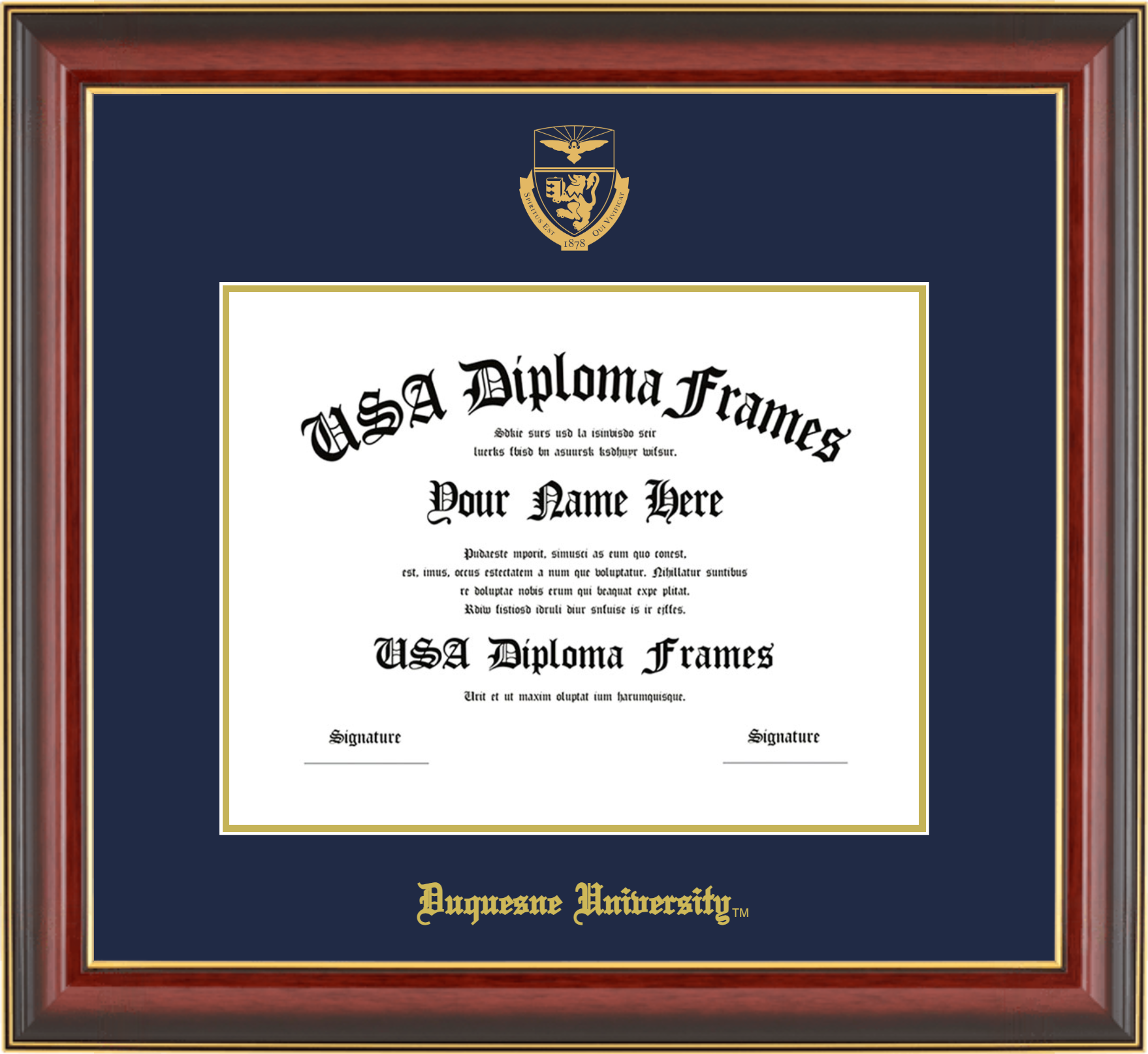 Duquesne University Diploma Frame – Cherry Mahogany Gold Trim Glossy – Navy and Gold Mat