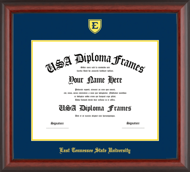 Want to explore more styles? Browse our full range of diploma frame layouts, or visit the East Tennessee State University to view options available for your school. Looking for a fully personalized design? Try our custom Frame Builder and create a frame that’s uniquely yours.