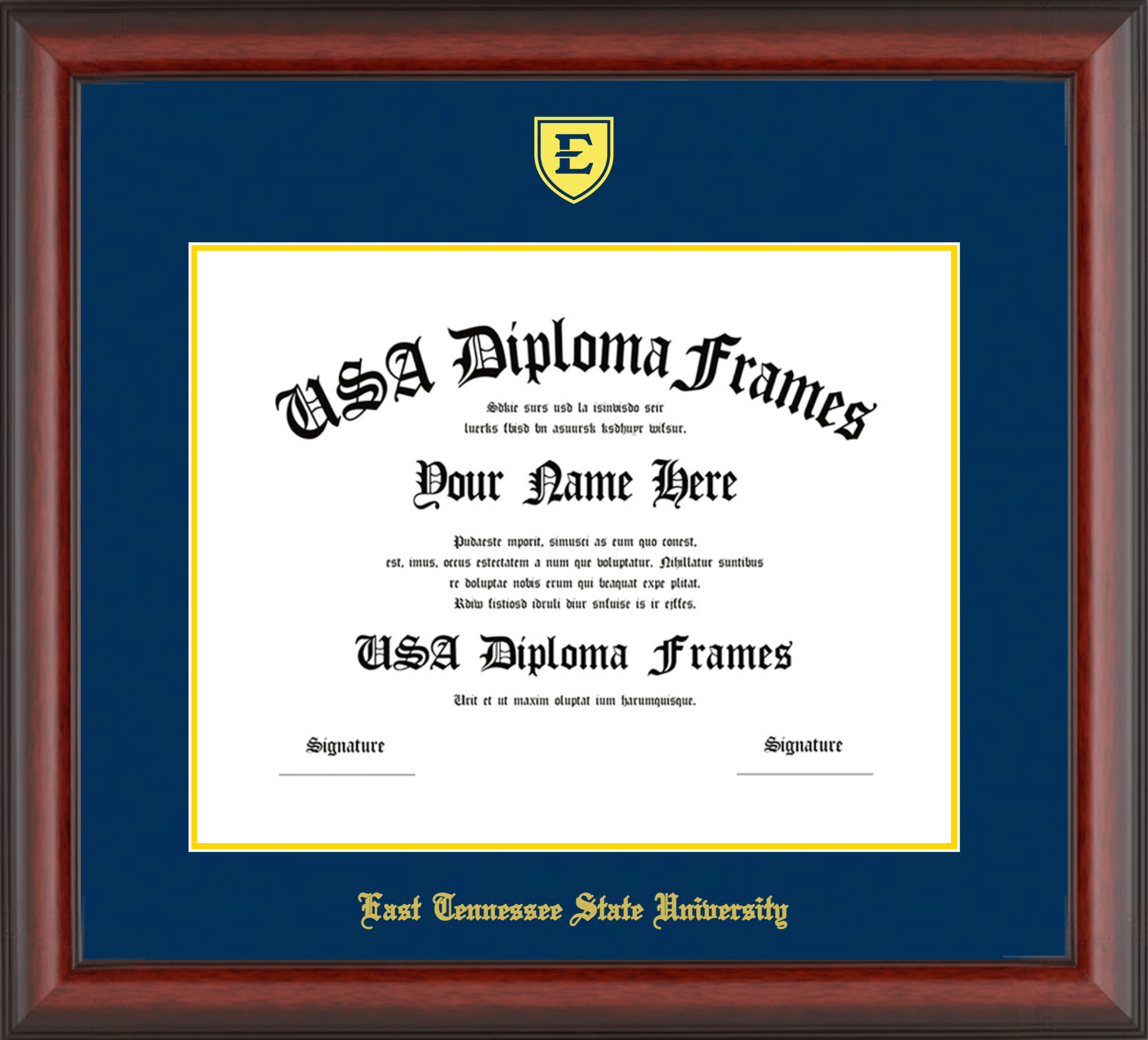 East Tennessee State University Diploma Frame – Cherry Mahogany Matte – Navy and Yellow Gold Mat