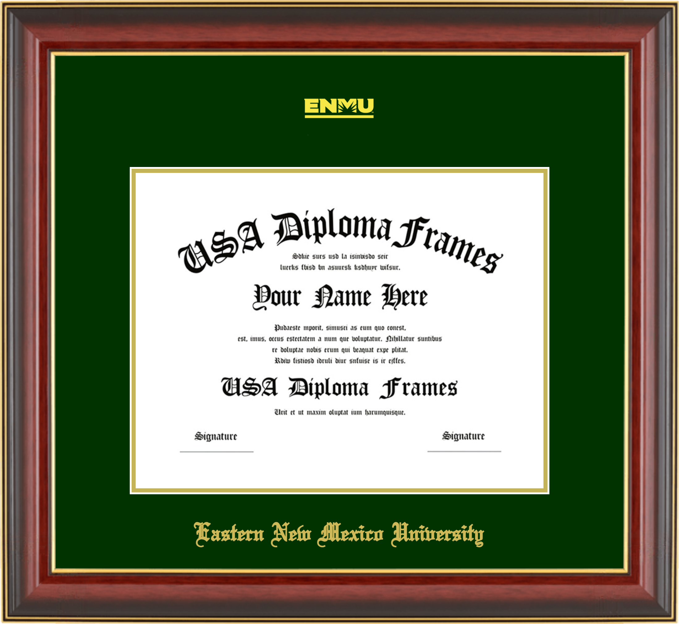 Eastern New Mexico University Diploma Frame – Cherry Mahogany Gold Trim Glossy – Winter Green and Gold Mat