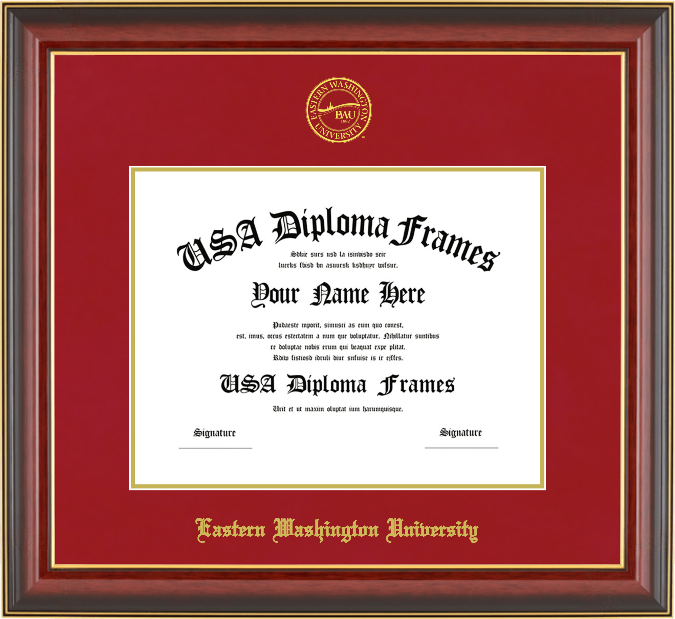 Want to explore more styles? Browse our full range of diploma frame layouts, or visit the Eastern Washington University to view options available for your school. Looking for a fully personalized design? Try our custom Frame Builder and create a frame that’s uniquely yours.