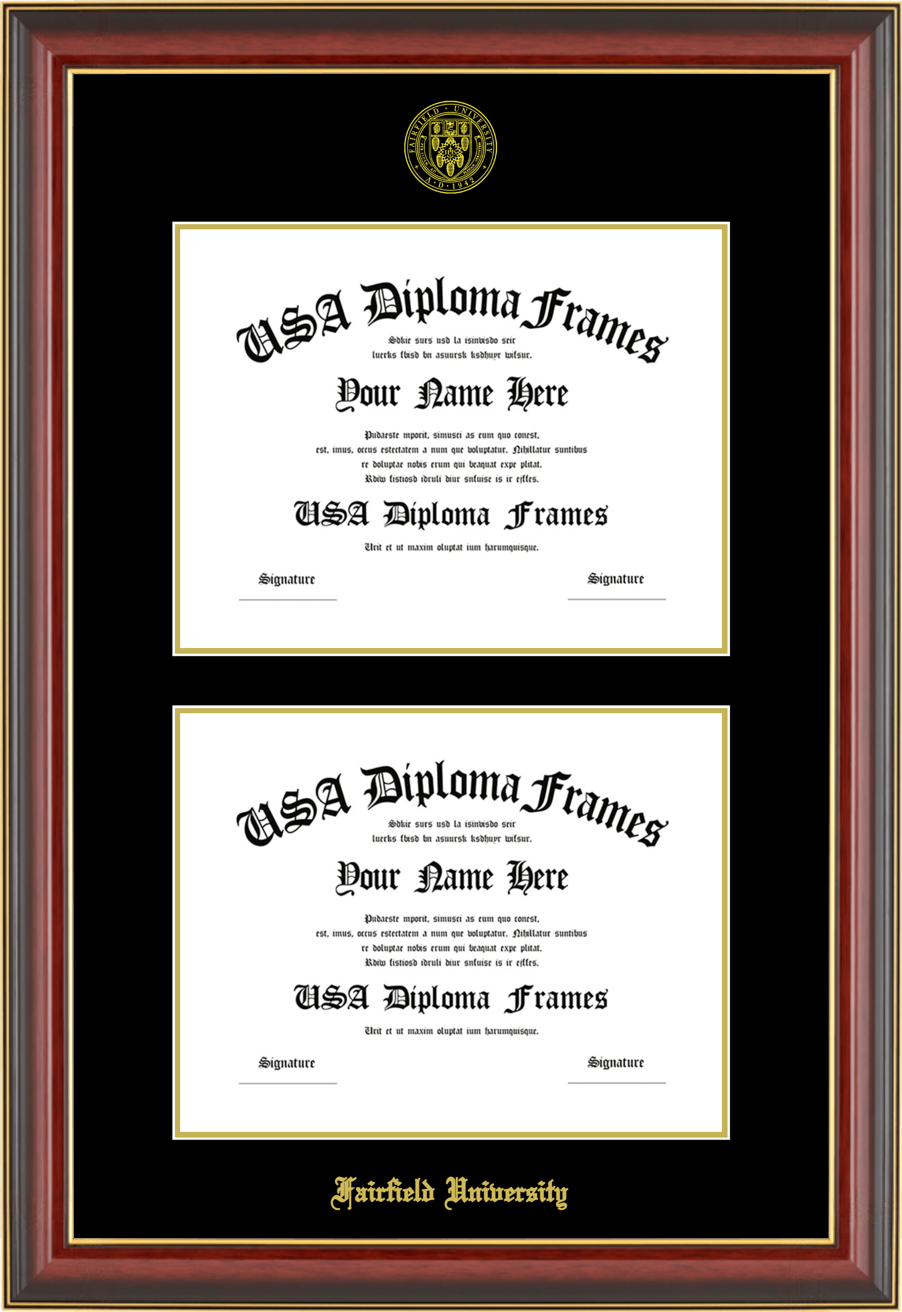 Fairfield University Double Diploma Frame – Cherry Mahogany Gold Trim Glossy – Black and Gold Mat