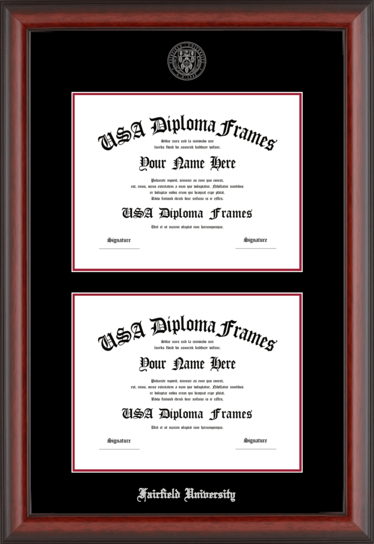 Fairfield University Double Diploma Frame – Cherry Mahogany Matte – Black and Crimson Mat – Silver Seal