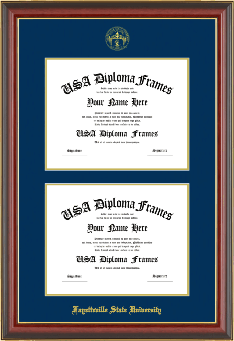 Fayetteville State University Double Diploma Frame – Double Document – Cherry Mahogany Gold Trim Glossy – Navy and Gold Mat