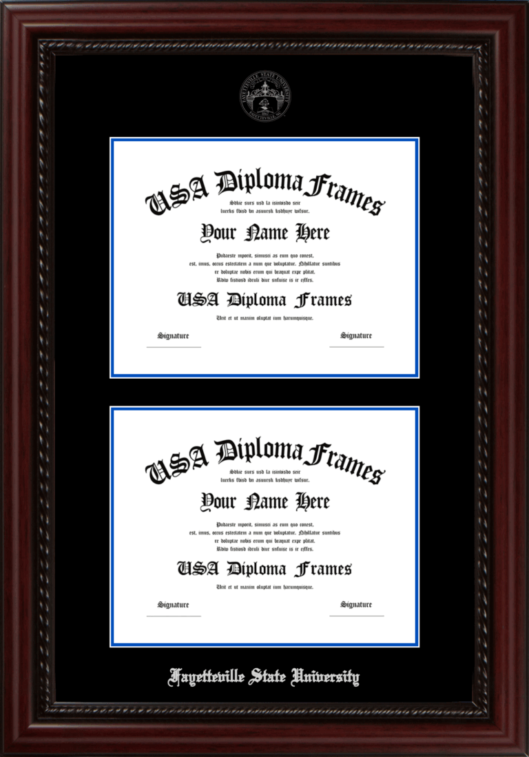 Fayetteville State University Double Diploma Frame – Double Document – Executive Cherry Rope – Black and Blue Mat – Silver Seal