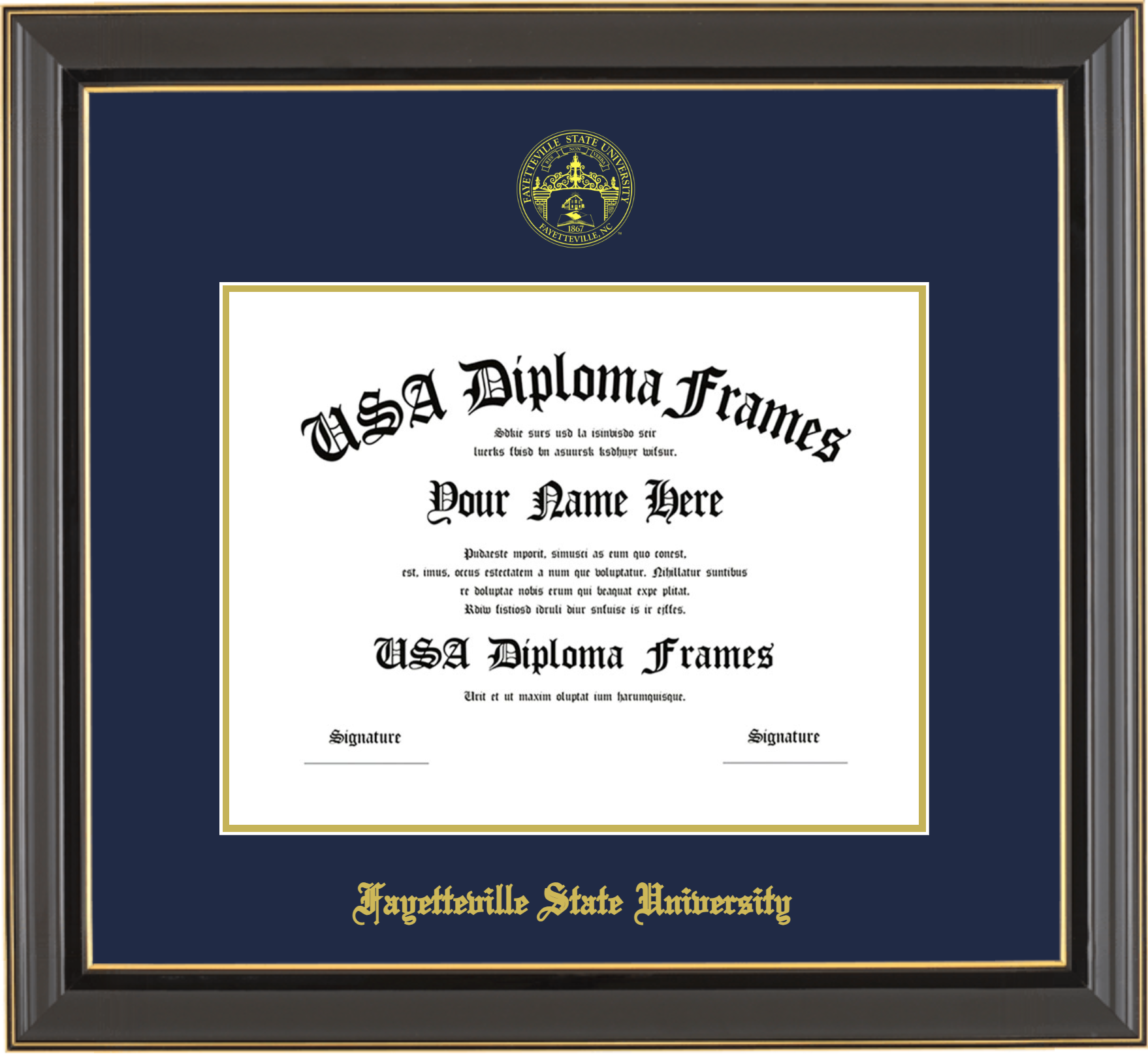 Fayetteville State University – Single Horizontal Document ( Diploma ) – Black Gold Trim Glossy – Navy Mat – Gold Accent Mat – With Seal(University Seal Gold) – With Gold Embossing (Fayetteville State University)