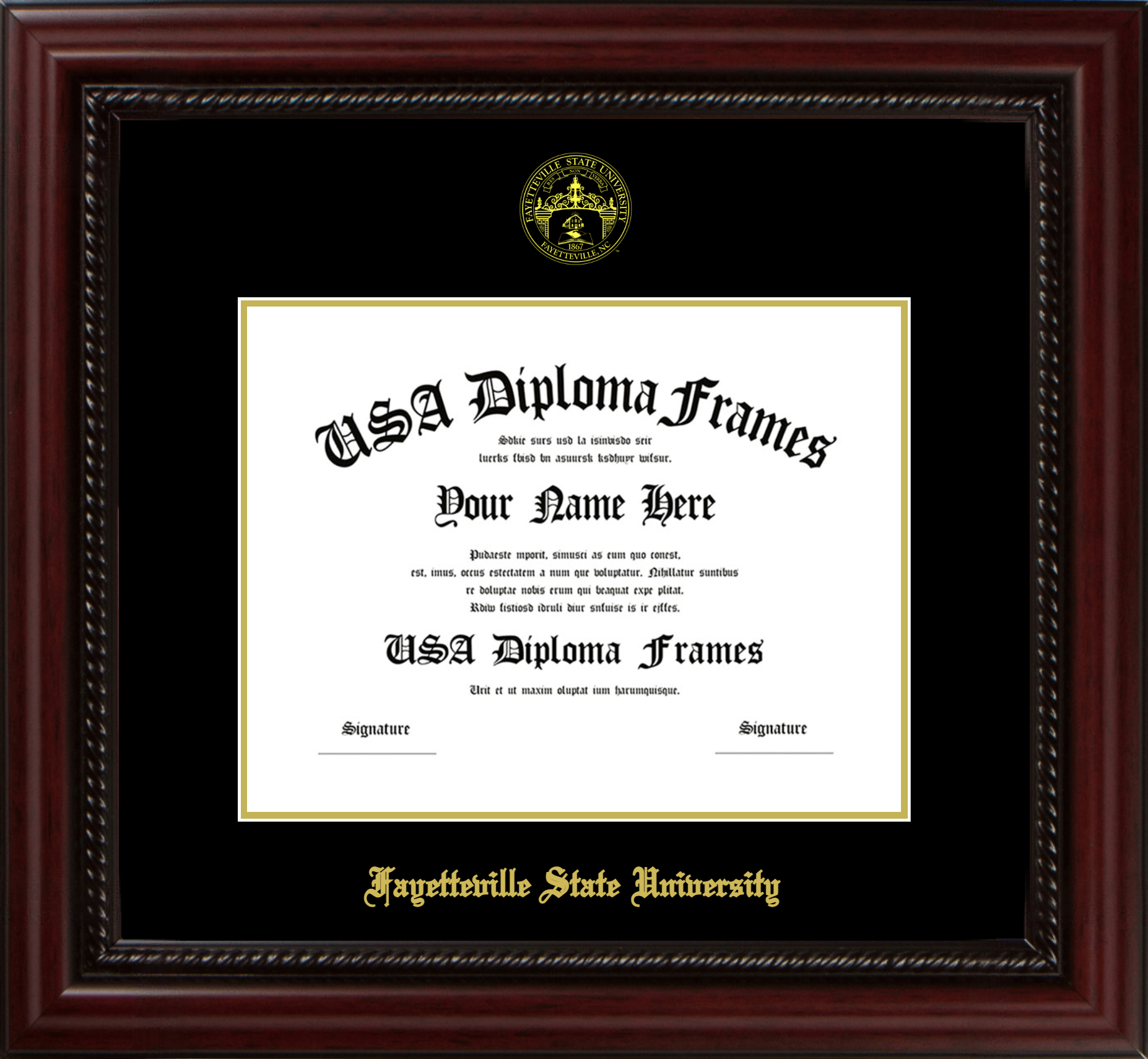 Fayetteville State University Diploma Frame – Executive Cherry Rope – Black and Gold Mat