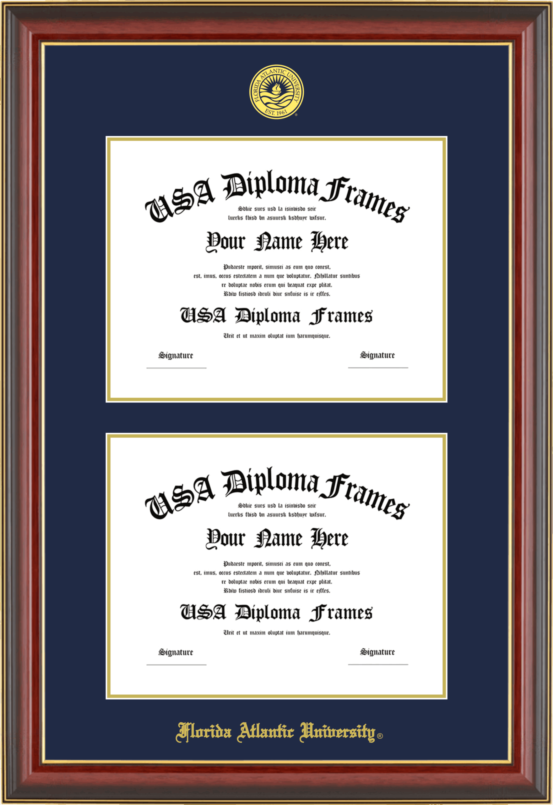Florida Atlantic University Double Diploma Frame – Double Document – Cherry Mahogany Gold Trim Glossy – Navy and Gold Mat