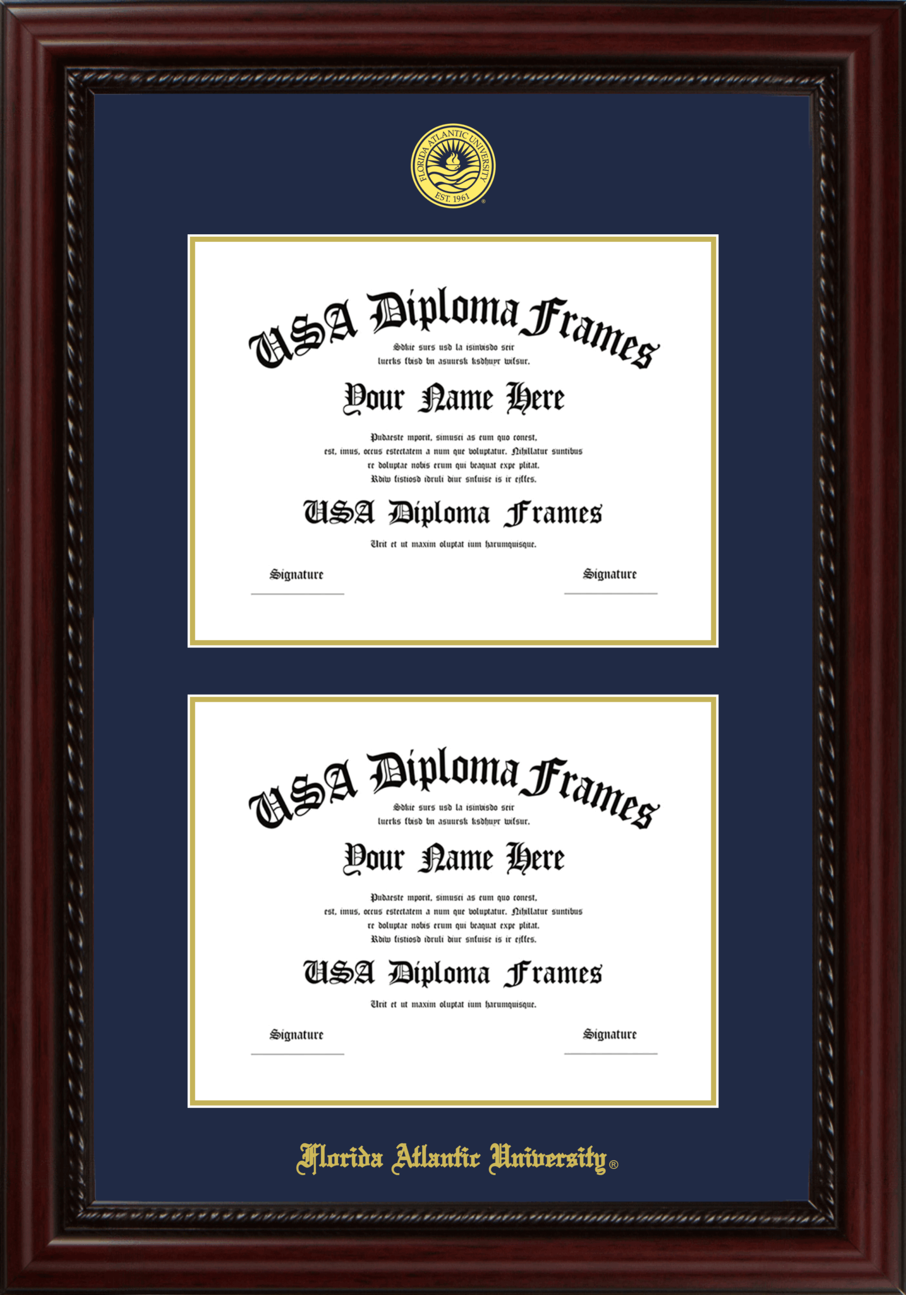 Florida Atlantic University Double Diploma Frame – Double Document – Executive Cherry Rope – Navy and Gold Mat