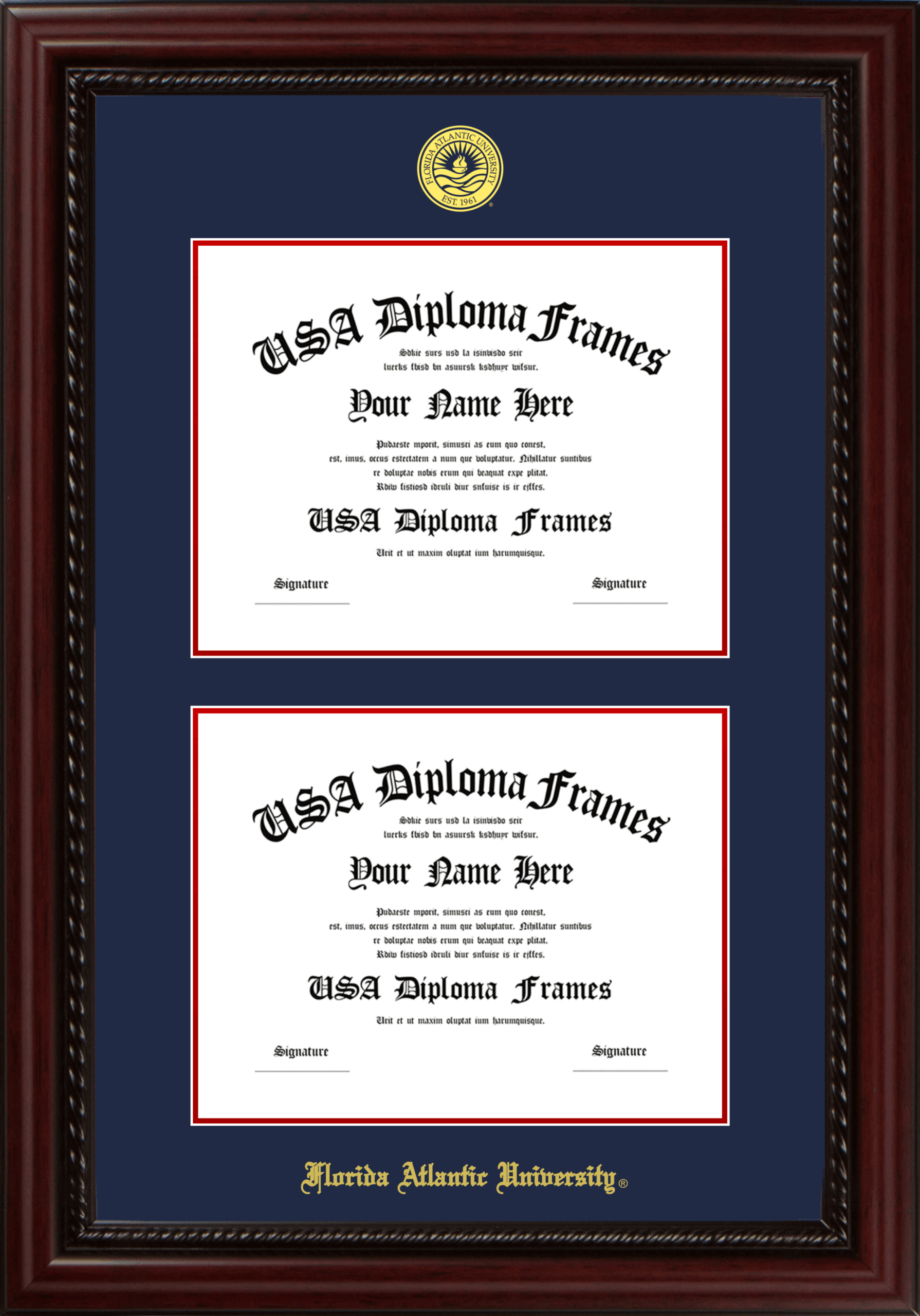 Florida Atlantic University Double Diploma Frame – Double Document – Executive Cherry Rope – Navy and Red Mat